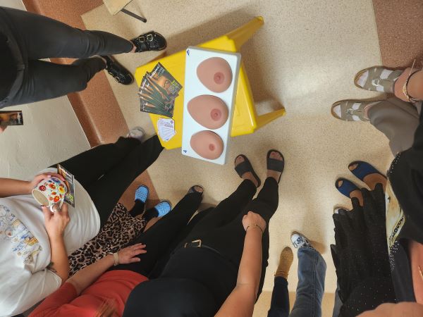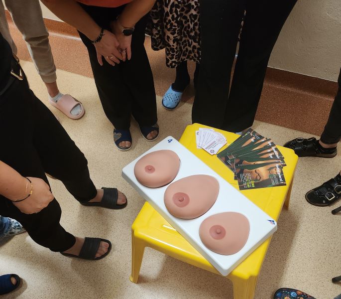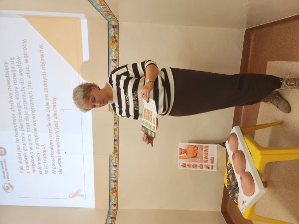 i profilaktykę raka piersi. Poinformowano o stronie internetowej Narodowego Portalu Okolicznego, na której można znaleźć rzetelną wiedzę dotyczącą profilaktyki i chorób nowotworowych. Za pomocą fantomu zaprezentowano technikę samobadania piersi oraz ukazano jak mogą wyglądać zmiany