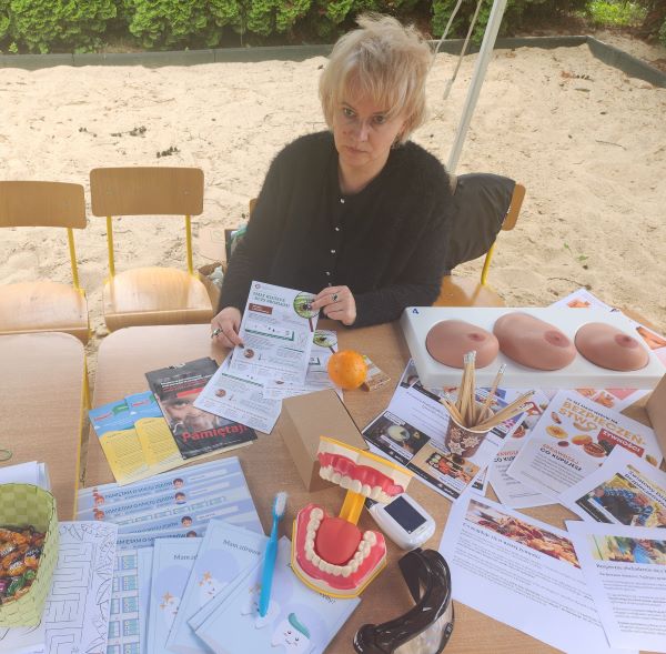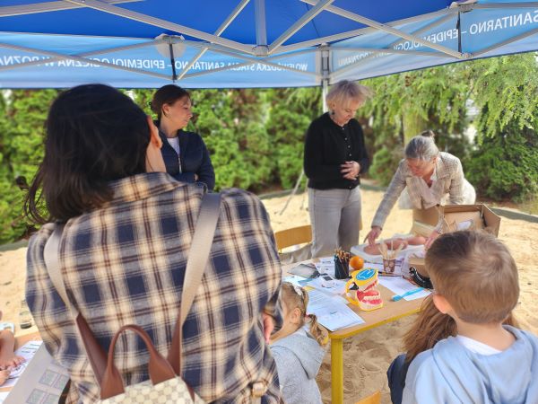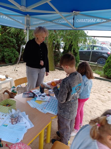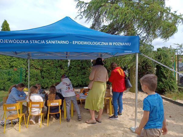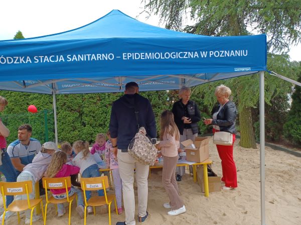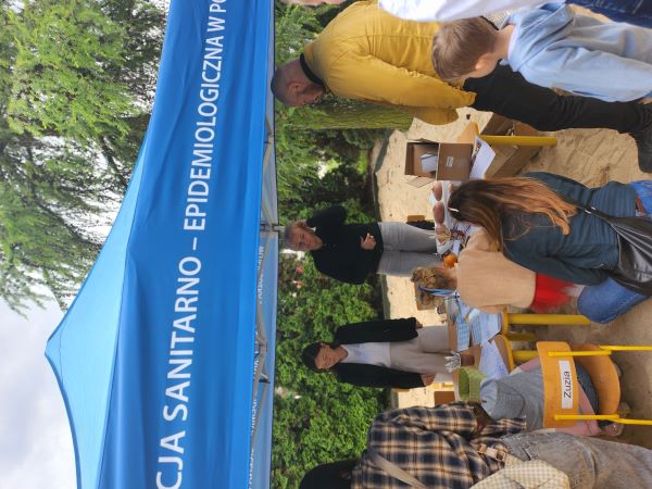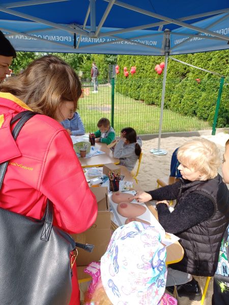 8 czercwa na zaproszenie Przedszkola nr 5 z oddziałami integracyjnymi „Słoneczny Zakątek” w Ostrzeszowie braliśmy udział w festynie rodzinnym. Prowadziliśmy działania edukacyjne dotyczące profilaktyki antytytoniowej, w ramach której osoby zainteresowane mogły zbadać zawartość tlenku węgla w wydychanym powietrzu za pomocą smokolyzera; profilaktyki raka piersi, w ramach której chętne panie mogły przećwiczyć samobadania piersi na fantomie; chorób odkleszczowych z instruktażem prawidłowego usuwania kleszcza, profilaktyki higieny jamy ustnej, w ramach której dzieci mogły przećwiczyć mycie zębów na modelu szczęki, chorób nowotworowych skóry, a także innych uzależnień. Uczestnicy festynu mogli sprawdzić za pomocą alkogogli, jak upośledzone są zmysły po spożyciu alkoholu czy innych substancji psychoaktywnych. Promowano także hasła Kampanii informacyjnej „Wybieraj zdrową żywność!” oraz programu edukacyjnego „Czyste powietrze wokół nas”.