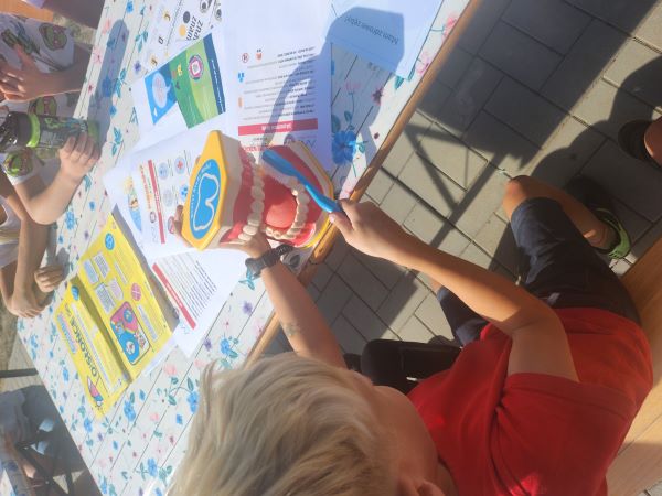 Kolejne spotkanie z dziećmi na temat zasad bezpieczeństwa zdrowotnego podczas letniego wypoczynku. Na spotkaniu omówiono jak bezpiecznie spędzać wakacje w lesie, górach, nad wodą i podczas upałów. Jak bezpiecznie korzystać ze słońca i z kąpieli. Przypomniano dzieciom jak ważna jest higiena osobista i prawidłowe mycie rąk, które może uchronić przed zatruciem pokarmowym. Omówiono profilaktykę mycia ząbków, chorób odlkeszczowych, prawidłowego odżywiania. W trakcie spotkania odbył się pokaz prawidłowego mycia zębów na modelu szczęki oraz instruktaż usuwania kleszcza. Przekazano materiały edukacyjne oraz gadżety za udział w spotkaniu.