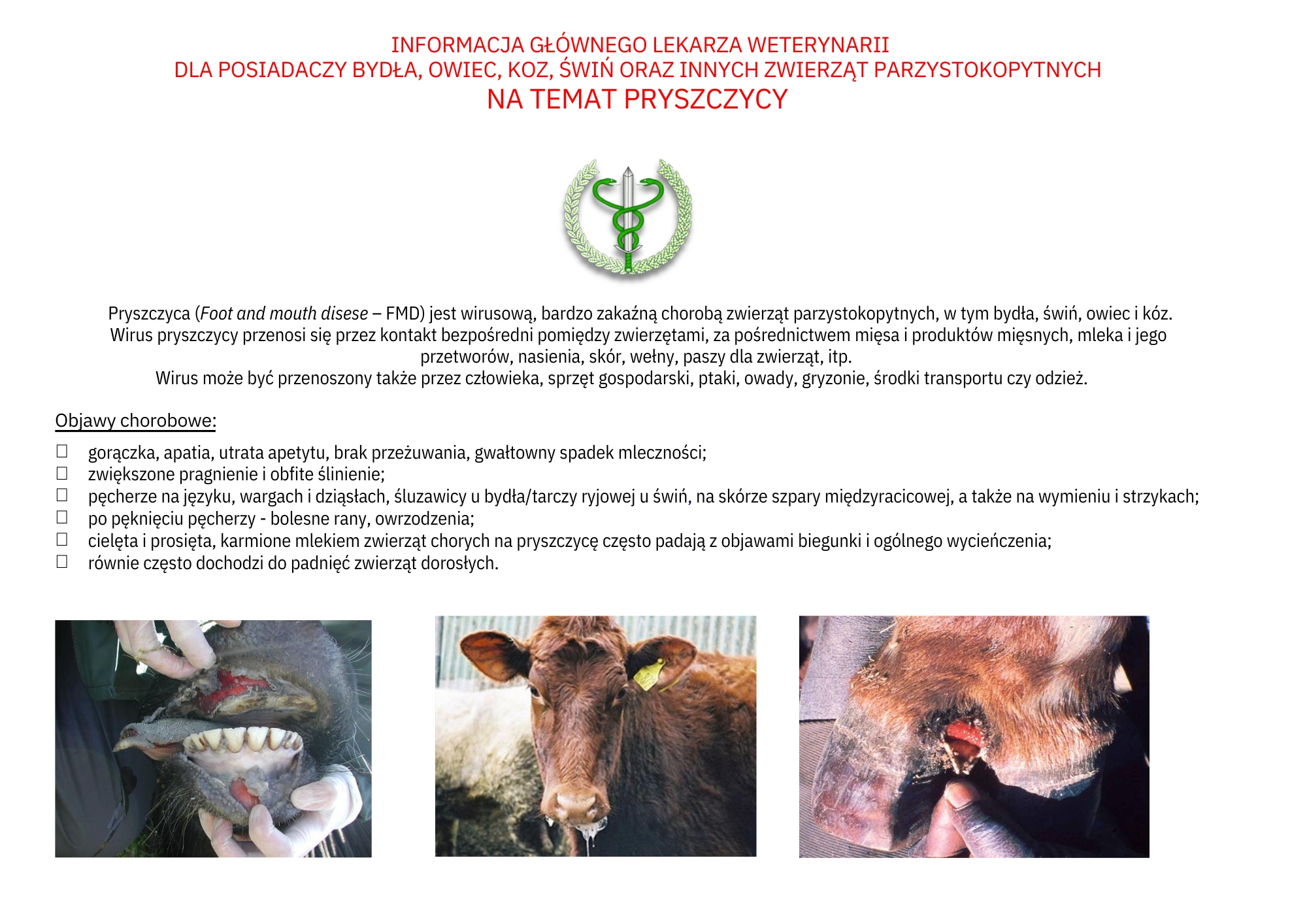 Pryszczyca (Foot and mouth disease - FMD) jest zakaźną i wysoce zaraźliwą chorobą wirusową zwierząt parzystokopytnych domowych oraz dzikich. Chorują najczęściej krowy, świnie, kozy, owce. Wirus, który jest wysoce zakaźny dla zwierząt, charakteryzuje się dużą odpornością w środowisku i łatwo szerzy się niezależnie od warunków atmosferycznych. Kraje, w których wystąpi FMD, narażone są na bardzo duże straty ekonomiczne w przemyśle mięsnym oraz hodowli, a także obowiązkową likwidację stad, w których stwierdzono zakażenie.