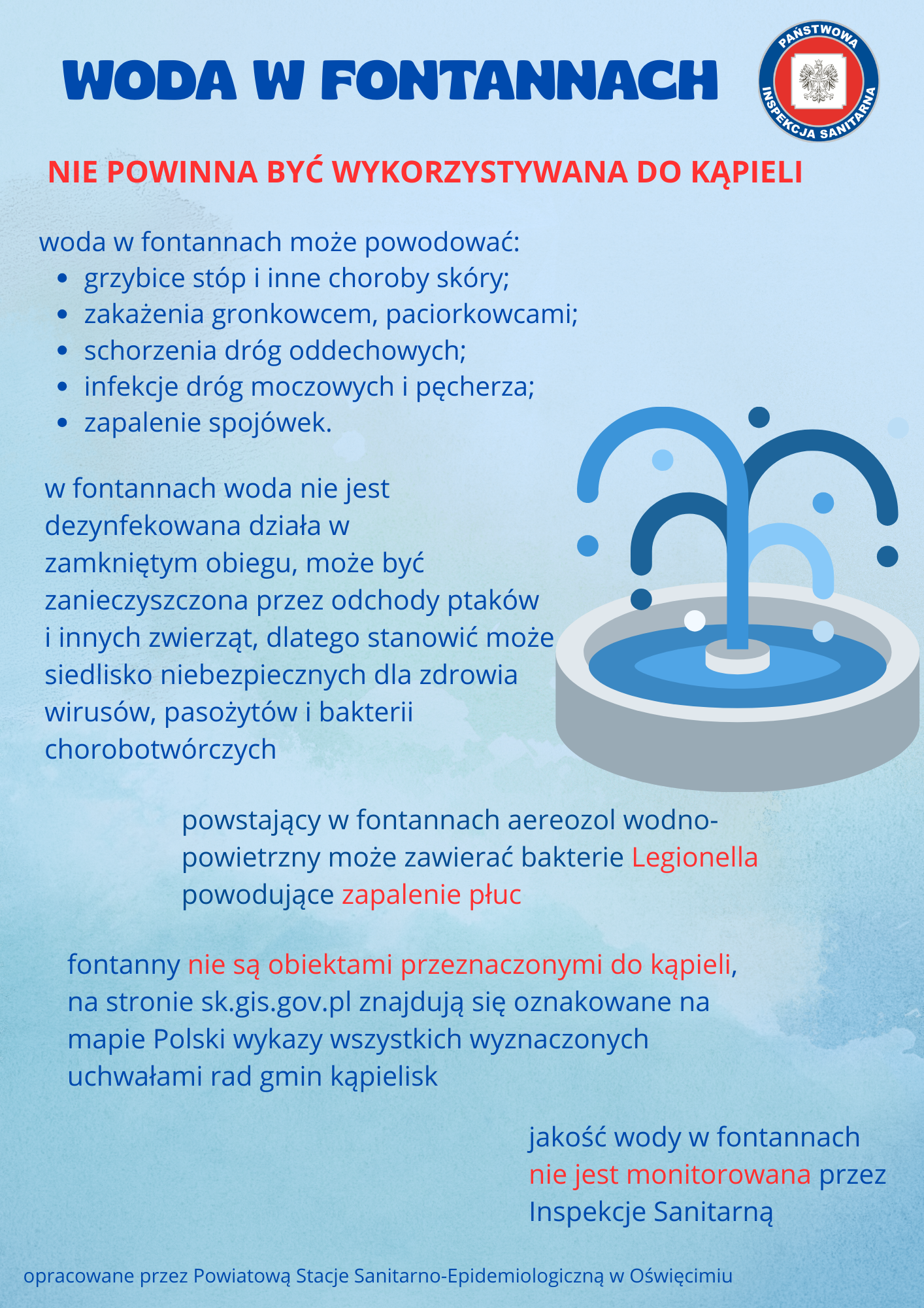 Państwowa Inspekcja Sanitarna nadzoruje jakość wody w wodociągach zbiorowego zaopatrzenia w wodę przeznaczoną do spożycia przez ludzi, wodę w basenach kąpielowych, wodę w kąpieliskach i miejscach okazjonalnie wykorzystywanych do kąpieli. Fontanny miejskie nie mają takiego przeznaczenia nie są więc nadzorowane - woda w fontannach nie podlega kontroli Państwowej Inspekcji Sanitarnej i nie nadaje się do spożycia ani do kąpieli czy zabawy.