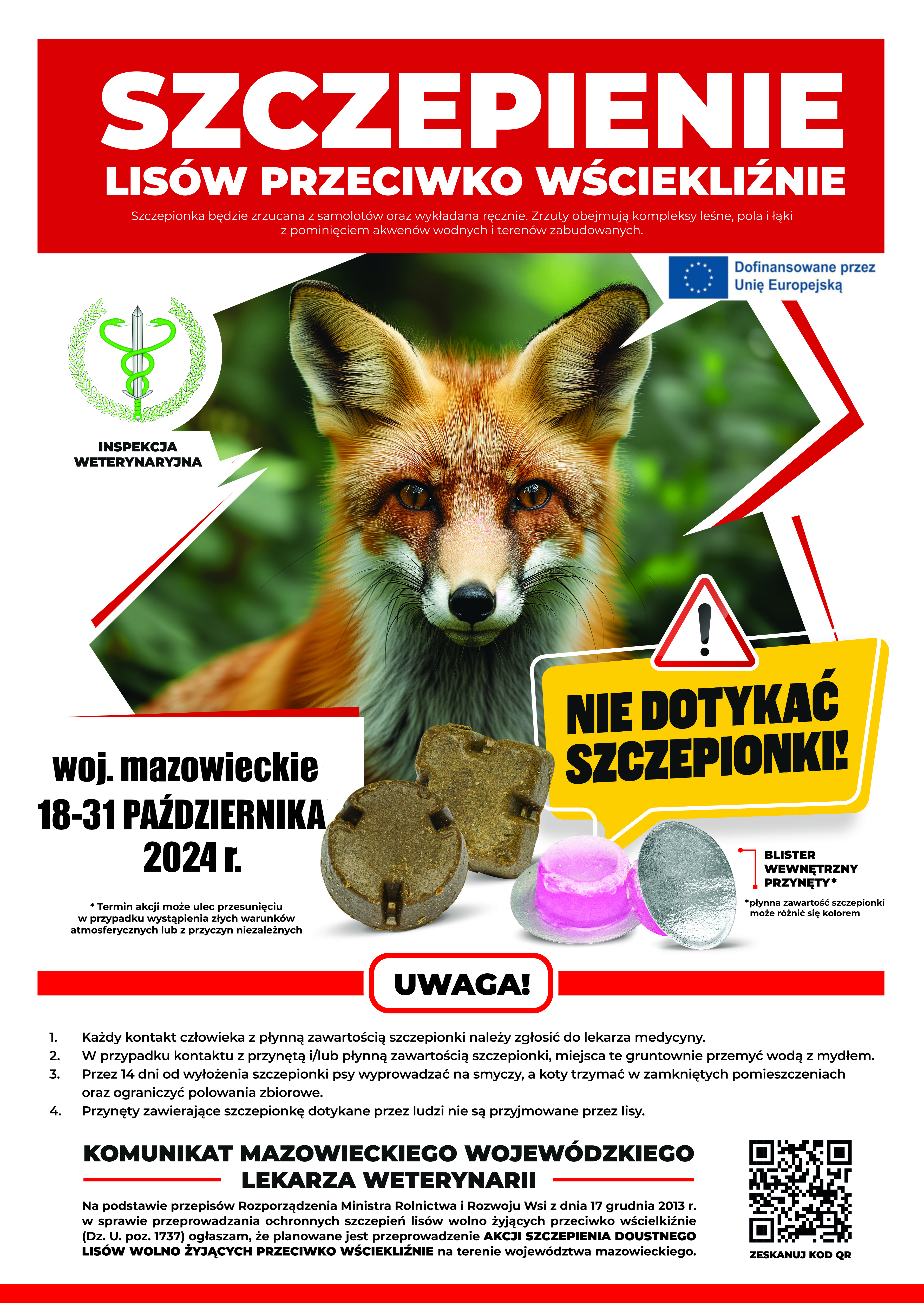 W dniach 18-31 października 2024 r. na terenie województwa mazowieckiego przeprowadzone zostanie ochronne szczepienie lisów wolno żyjących doustną szczepionką RABADROP. Zrzuty oraz wyłożenie ręczne obejmą kompleksy leśne, pola, łąki z pominięciem akwenów wodnych, dróg i obszarów zabudowanych. Szczepionka umieszczona jest w przynęcie w postaci krążka, koloru brunatno- zielonego, o zapachu rybnym. Lis podejmuje szczepionkę, która nie była dotknięta przez człowieka.
