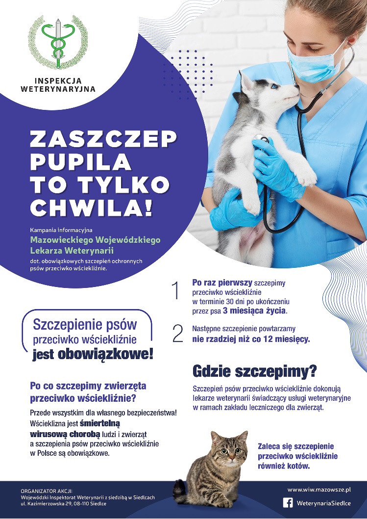 Mazowiecki Wojewódzki Lekarz Weterynarii prowadzi kampanię informacyjną „Zaszczep pupila, to tylko chwila” promującą obowiązkowe szczepienia psów przeciwko wściekliźnie na terenie województwa mazowieckiego.
