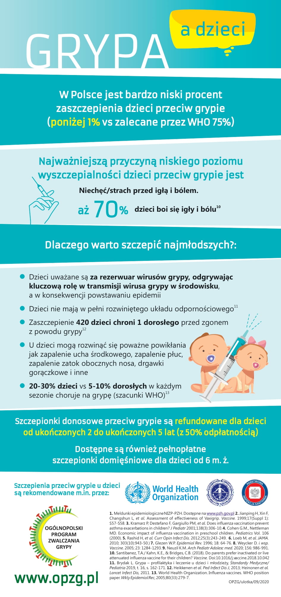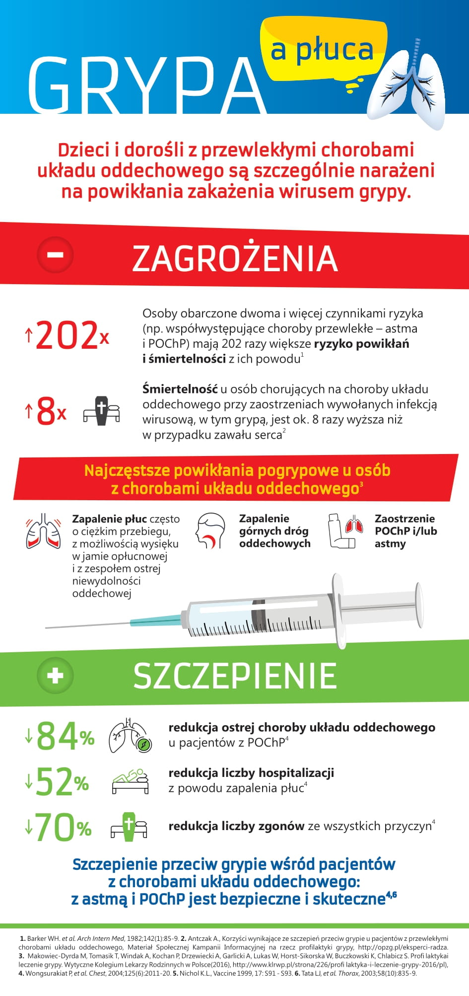 Grypa-to ostra, sezonowa choroba wirusowa, wywoływana przez wirusa grypy typu A lub B. Występuje na całym świecie. Objawy grypy to m.in. wysoka temperatura, ból głowy, zmęczenie, kaszel, bóle mięśni i stawów. Leczenie grypy polega na wypoczynku, przyjmowaniu dużej ilości płynów oraz łagodzeniu objawów. Najczęściej zachorowania odnotowuje się w sezonie jesienno-zimowym. W Polsce szczyt zachorowań to okres między styczniem a marcem. Corocznie 5‒10 proc. dorosłych i 20‒30 proc. dzieci.