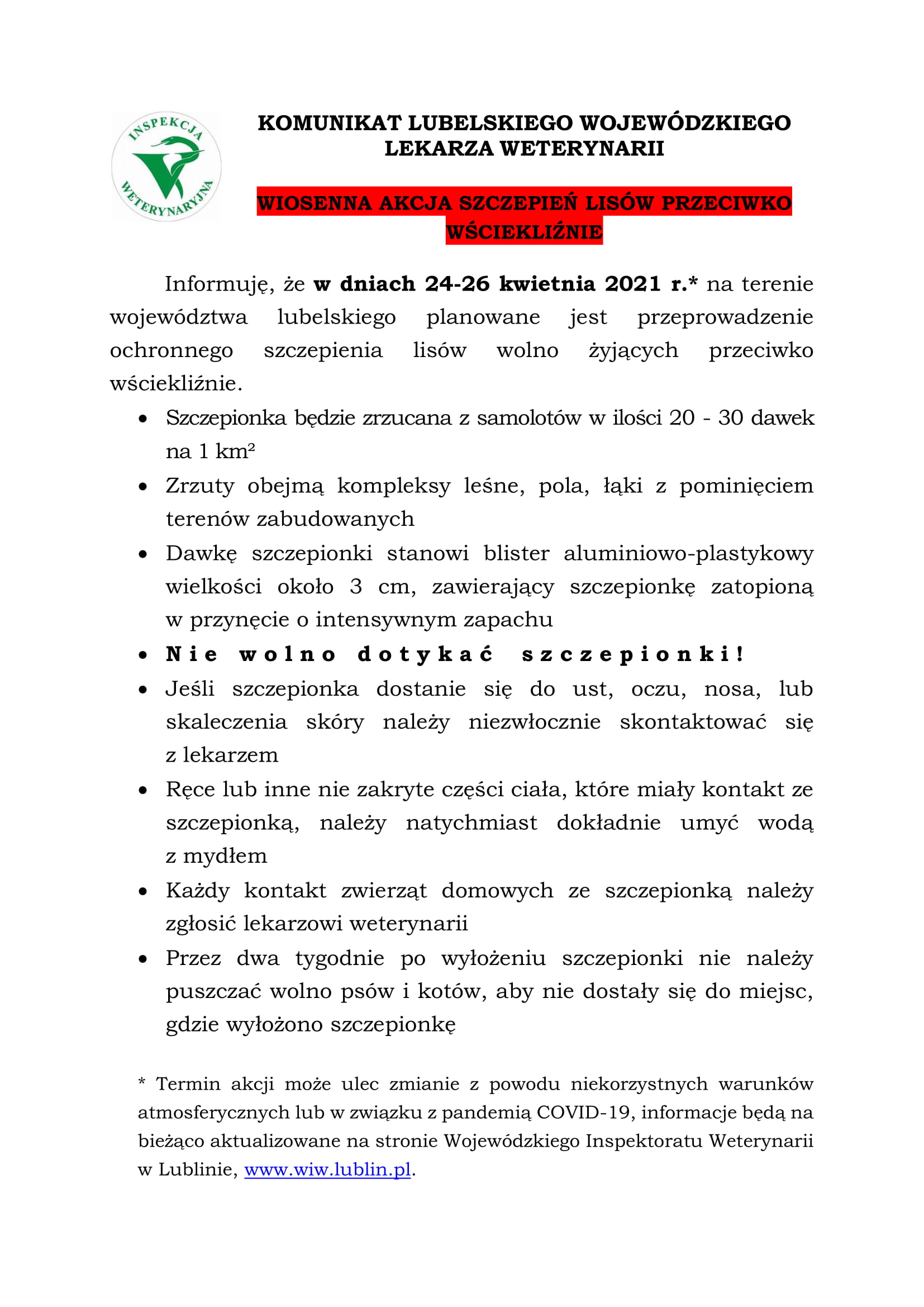* Termin akcji może ulec zmianie z powodu niekorzystnych warunków atmosferycznych lub w związku z pandemią COVID-19, informacje będą na bieżąco aktualizowane na stronie Wojewódzkiego Inspektoratu Weterynarii w Lublinie, www.wiw.lublin.pl.