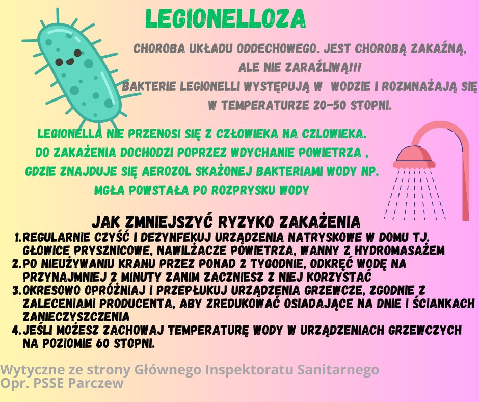 Utrzymujące się wysokie temperatury powietrza sprzyjają namnażaniu się pałeczek Legionella w wewnętrznych instalacjach wodnych. W związku z zakażeniami tą bakterią, Główny Inspektor Sanitarny polecił wszystkim jednostkom Państwowej Inspekcji Sanitarnej w kraju wzmocnienie nadzoru nad przestrzeganiem zasad bezpieczeństwa zdrowotnego wody przez zarządzających wodociągami i instalacjami wodnymi. Dotyczy to także obiektów takich, jak szpitale czy domy pomocy społecznej.