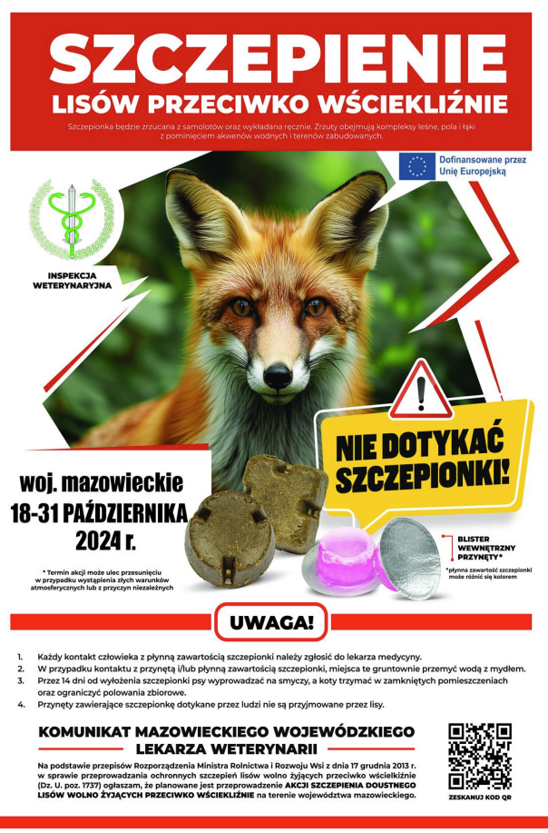 W dniach 18-31 października 2024 r. Mazowiecki Wojewódzki Lekarz Weterynarii z udziałem Powiatowych Lekarzy Weterynarii przeprowadza akcję szczepienia lisów wolno żyjących przeciwko wściekliźnie na terenie województwa mazowieckiego. Szczepionka będzie wykładana ręcznie oraz zrzucana z samolotów na lasy, pola i łąki. Przynęty ze szczepionką nie wolno dotykać. Zwierzęta nie przyjmą tych z zapachem człowieka. Przez dwa tygodnie od wyłożenia szczepionki należy zachować ostrożność podczas wyprowadzania zwierząt. Na terenie województwa mazowieckiego zostanie przeprowadzona akcja szczepień lisów wolno żyjących przeciwko wściekliźnie. Szczepienie wykonuje się przy użyciu doustnej szczepionki RABADROP umieszczonej we wnętrzu przynęty, w kształcie krążka lub kwadratu, koloru brunatno-zielonego o zapachu rybnym. Zrzuty oraz wyłożenie ręczne nie obejmują zbiorników wodnych, dróg i terenów zabudowanych. Szczepionka uodparnia wyłącznie lisy. Każdy, kto miałby styczność ze szczepionką powinien niezwłocznie skontaktować się z lekarzem medycyny. Należy także zwrócić uwagę na domowe czworonogi, których ewentualny kontakt z preparatem należy zgłosić lekarzowi weterynarii. Lis jest zwierzęciem wolno żyjącym, najbardziej podatnym na zakażenie wirusem wścieklizny. Regularne szczepienia zmniejszają ryzyko zachorowań. Akcja szczepienia lisów wolno żyjących jest współfinansowana ze środków unijnych Unii Europejskiej.