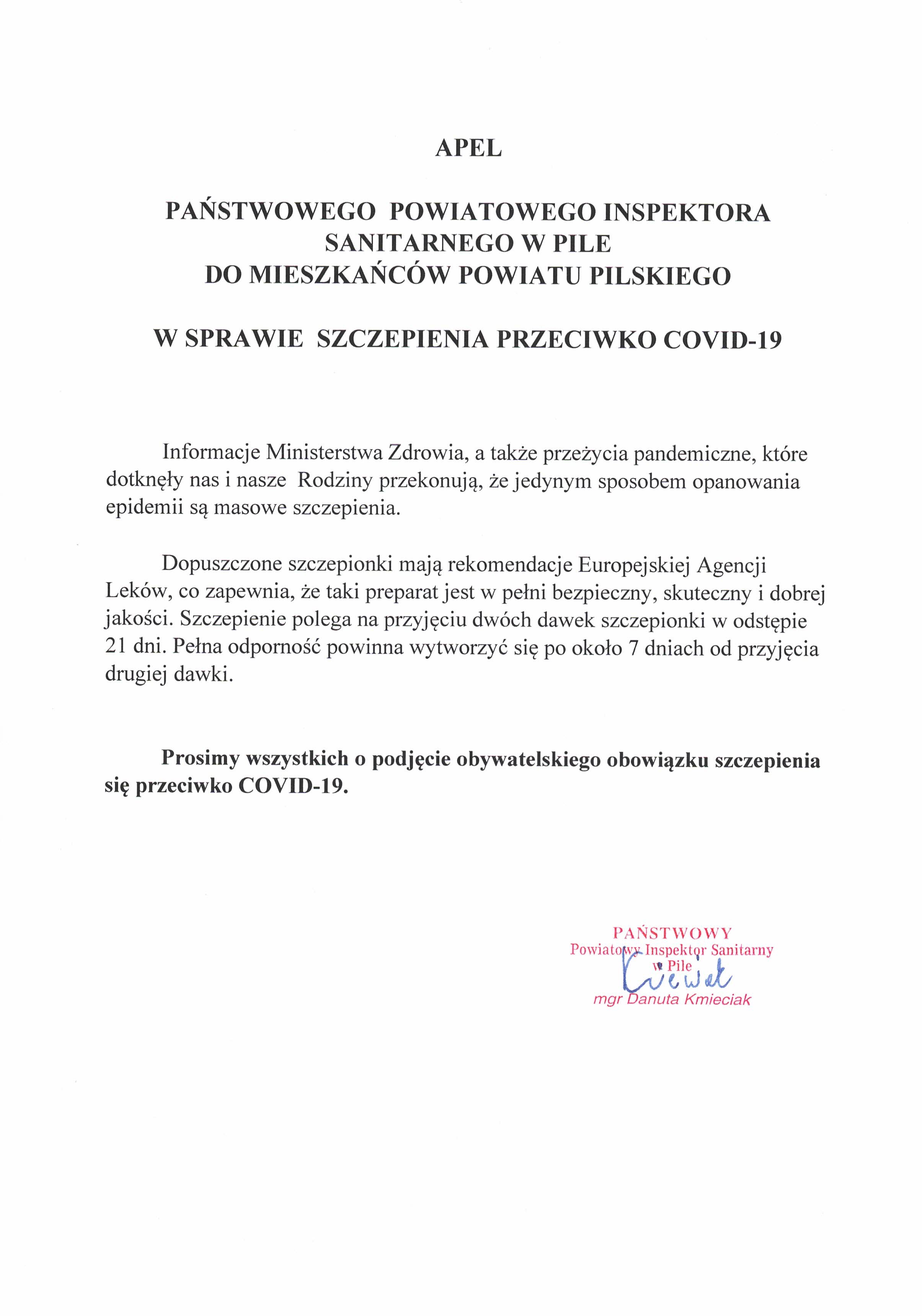 Apel Państwowego Powiatowego Inspektora Sanitarnego w Pile do mieszkańców powiatu pilskiego w sprawie szczepienia przeciwko COVID-19 Zdjęcia (1) Pokaż zdjęcie 1 z galerii.