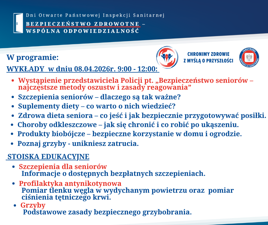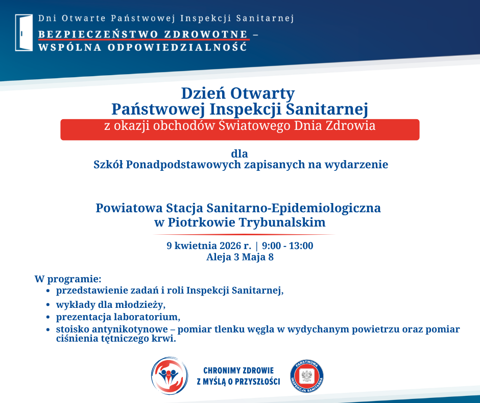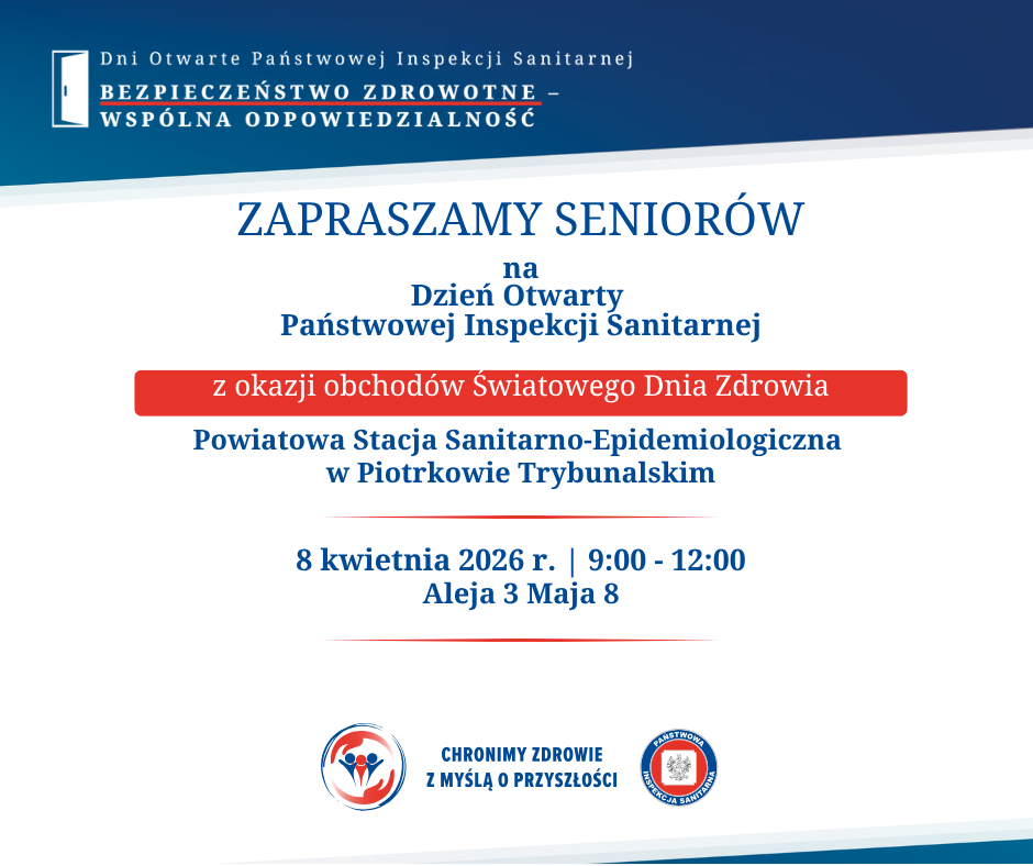 Państwowy Powiatowy Inspektor Sanitarny w Piotrkowie Trybunalskim serdecznie zaprasza seniorów 8 kwietnia 2026 r. oraz szkoły ponadpodstawowe 9 kwietnia 2026 r. (zgłoszenie potwierdzone) na Dni Otwarte Państwowej Inspekcji Sanitarnej, organizowane z okazji Światowego Dnia Zdrowia.