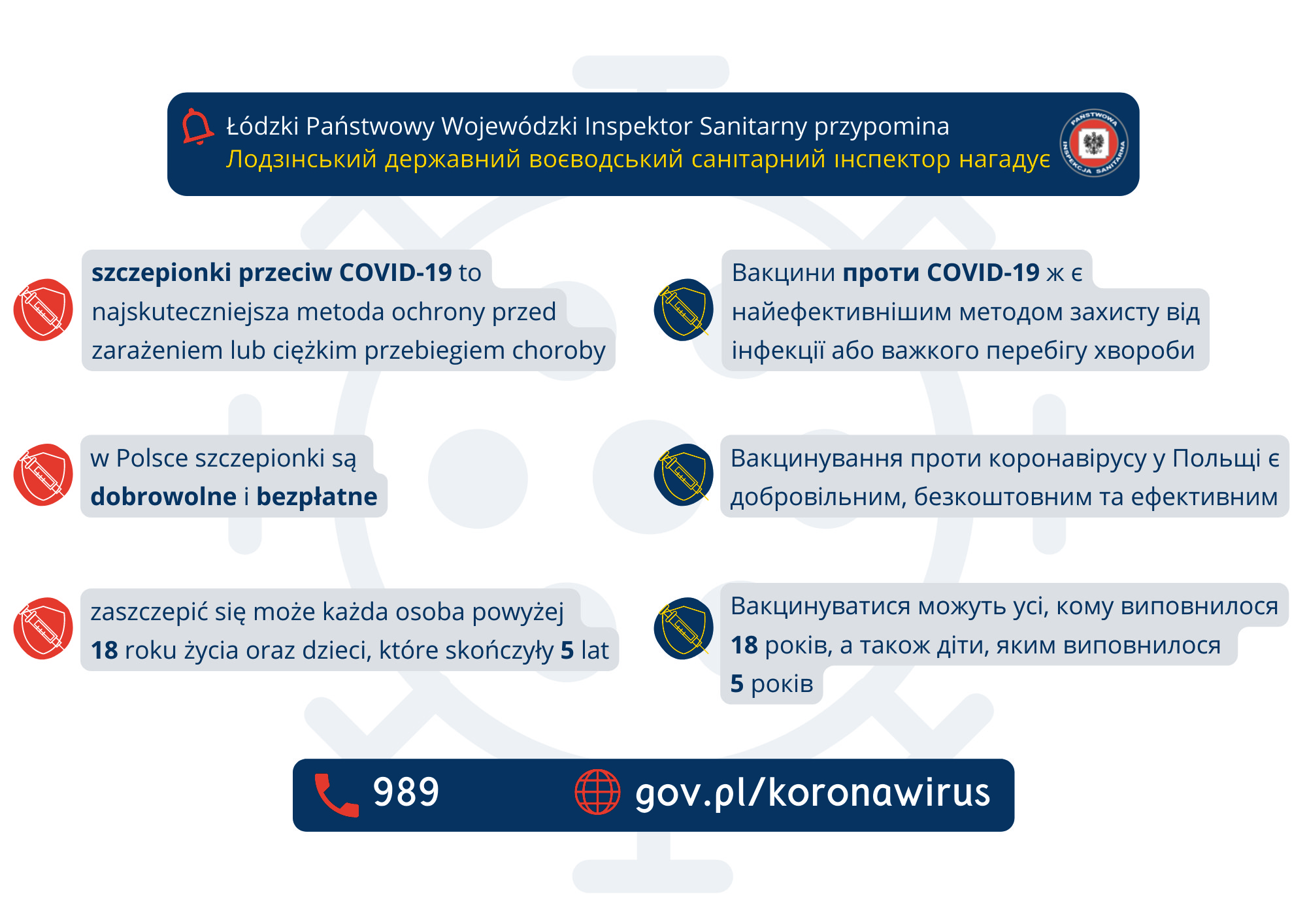 Informujemy, iż w terminie od 19.04.2022r. do 02.05.2022r. na terenie województwa łódzkiego będzie realizowana Kampania informacyjno-promocyjna dotycząca szczepień przeciwko COVID-19. Na naszym terenie Kampania adresowana będzie do mieszkańców powiatu piotrkowskiego oraz przybyłej grupy uchodźców z Ukrainy. Stosowanie szczepień jest najbardziej skuteczną metodą zapobiegania przenoszeniu się chorób oraz ciężkiemu przebiegowi choroby. Każdy zaszczepiony to potencjalnie od kilku do kilkunastu osób uchronionych przed chorobą. Nagłaśnianie informacji i stałe jej przypominanie ma na celu doinformowanie społeczeństwa o wciąż istniejącym zagrożeniu oraz dynamicznie zmieniającej się sytuacji epidemiologicznej i pojawianiu się nowych wariantów wirusa SARS -CoV-2.