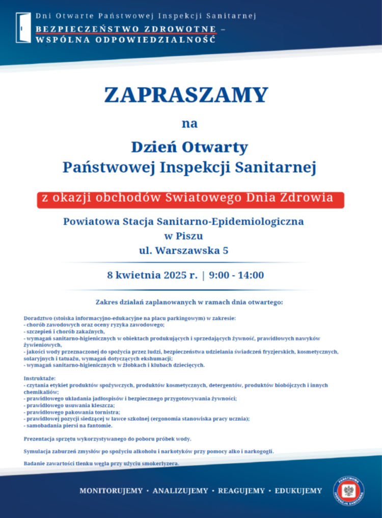 Zapraszamy mieszkańców powiatu piskiego na Dzień Otwarty Państwowej Inspekcji Sanitarnej, który odbedzie się w dniu 8 kwietnia 2025.