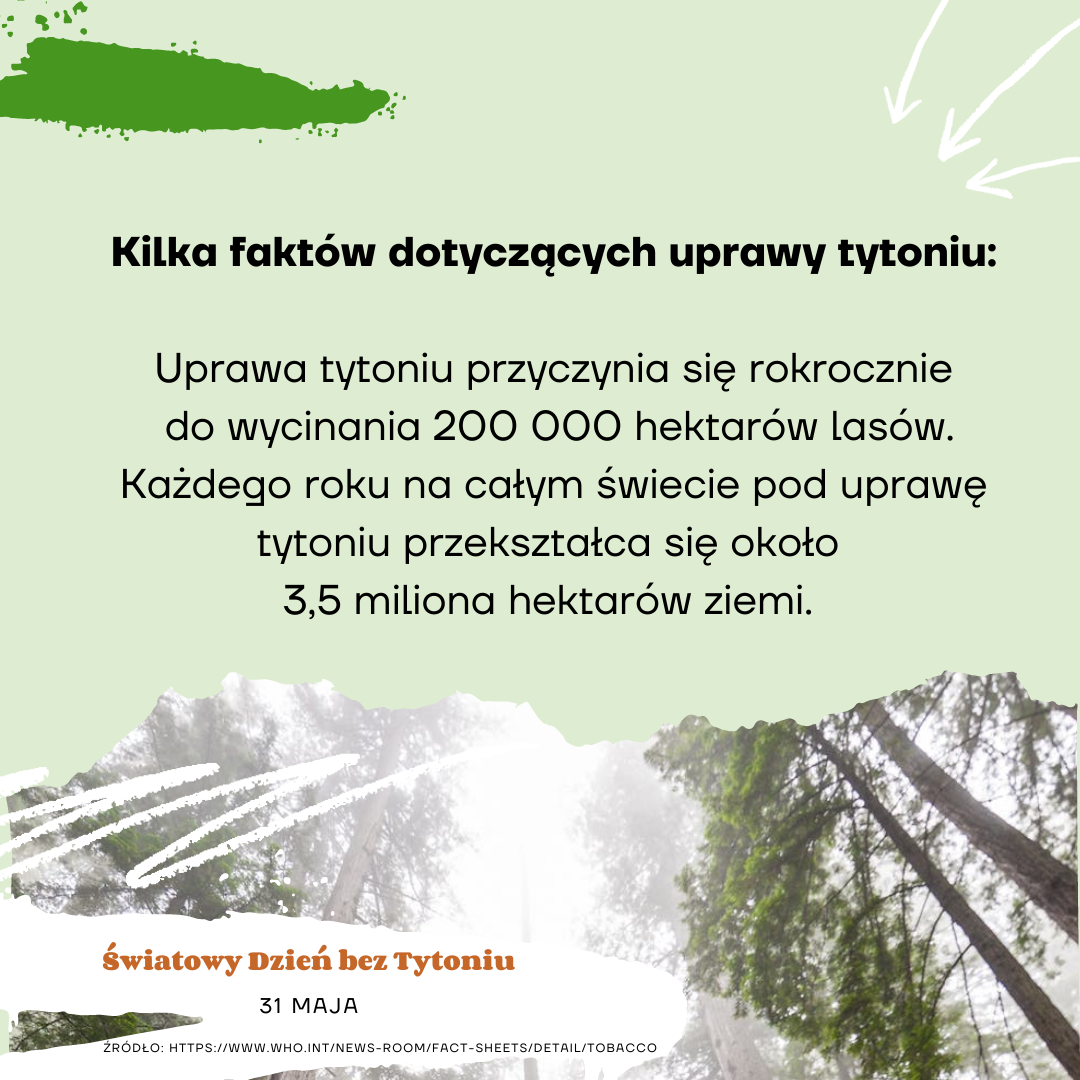 Światowa Organizacja Zdrowia (WHO) zwraca uwagę, że uprawa tytoniu szkodzi naszemu zdrowiu, zdrowiu rolników i zdrowiu planety. Przemysł tytoniowy blokuje próby zastąpienia uprawy tytoniu innymi uprawami, przyczyniając się do światowego kryzysu żywnościowego. Tytoń to nie tylko zagrożenie dla zdrowia, ale także nieodwracalna utrata cennych zasobów środowiska, takich jak źródła wody, lasy, rośliny i gatunki zwierząt.