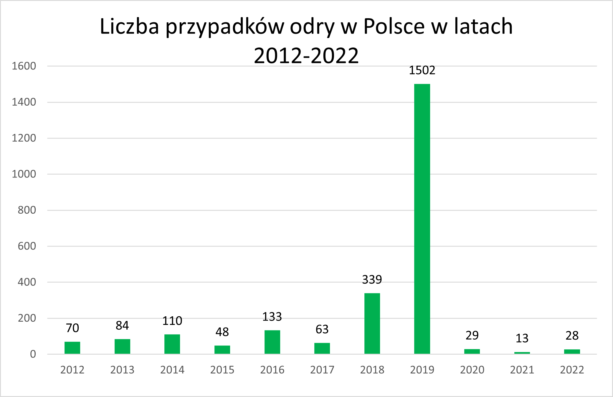 Wykres 1. Liczba przypadków odry w Polsce w latach 2012-2022