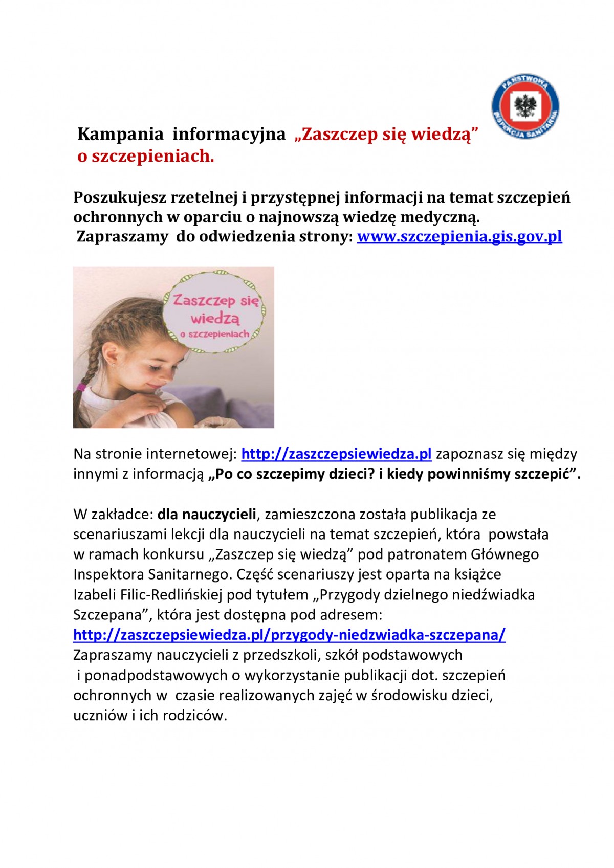 Państwowy Wojewódzki Inspektor Sanitarny w Warszawie uprzejmie informuje, że w ramach ogólnopolskiej akcji „Zaszczep się wiedzą”, powstała Bajka „Przygody Dzielnego Niedźwiadka Szczepana”. Akcja „Zaszczep się wiedzą” ma na celu informowanie o szczepieniach ochronnych w oparciu o najnowszą wiedzę medyczną oraz przekazywanie wiarygodnych, przystępnych informacji na temat szczepień. Wydawnictwo zostało objęte patronatem przez Główny Inspektorat Sanitarny oraz Fundację Rozwoju Pediatrii. Ilustrowaną publikację w formacie plików pdf, epub i mobi można pobrać za darmo ze strony www.zaszczepsiewiedza.pl/bajka-dla-dzieci. Tam również znajduje się audiobook, którego słuchanie umili wieczory całej rodzinie. W najbliższym czasie powinna ukazać się wersja drukowana.