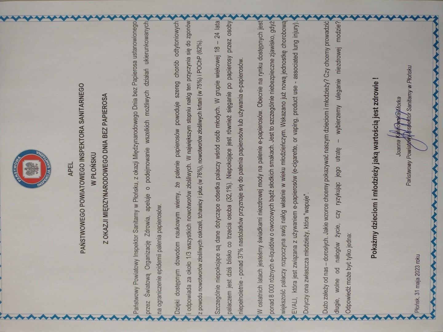 Joanna Kalinowska-Morka wręczyła Apel Państwowego Powiatowego Inspektora Sanitarnego w Płońsku o podejmowanie wszelkich możliwych działań ukierunkowanych na ograniczenie epidemii palenia papierosów.