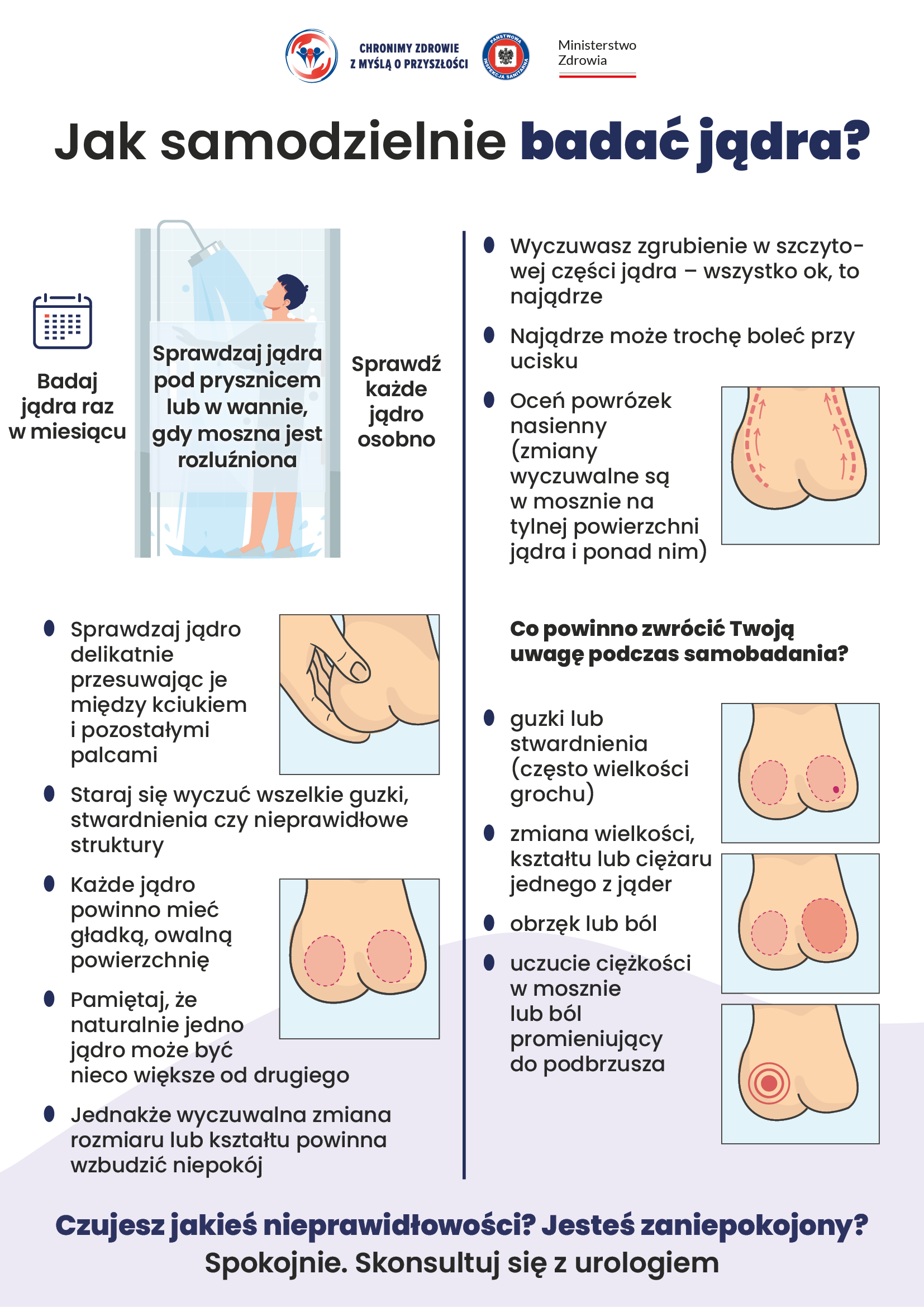 - samobadanie jąder raz w miesiącu (najlepiej po kąpieli lub prysznicu),