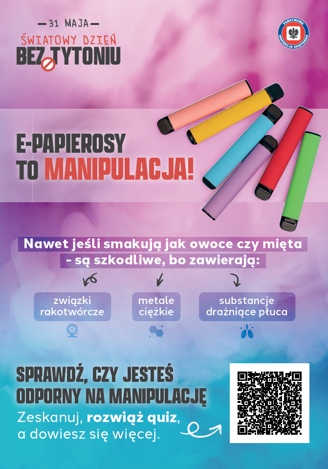 W związku z przypadającym na dzień 31 maja Światowym Dniem bez Tytoniu Główny Inspektorat Sanitarny rozpoczął kampanię edukacyjno-informacyjną pod hasłem: „E papierosy to manipulacja!”. Kampania skierowana jest do dwóch głównych grup odbiorców: dorosłych - rodziców i nauczycieli oraz młodzieży.