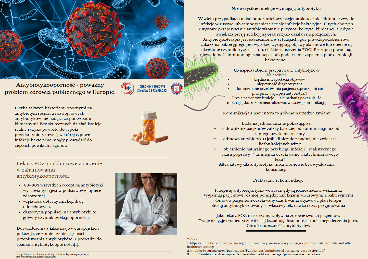 Niezwykle istotna jest również asertywna postawa lekarzy: decyzja o przepisaniu antybiotyku powinna wynikać z analizy danych klinicznych, wytycznych i dostępnej diagnostyki, a nie z presji pacjenta. Zjawisko „wymuszania recepty na antybiotyk” przy infekcjach, które są prawdopodobnie wirusowe, pozostaje jednym z czynników napędzających oporność.