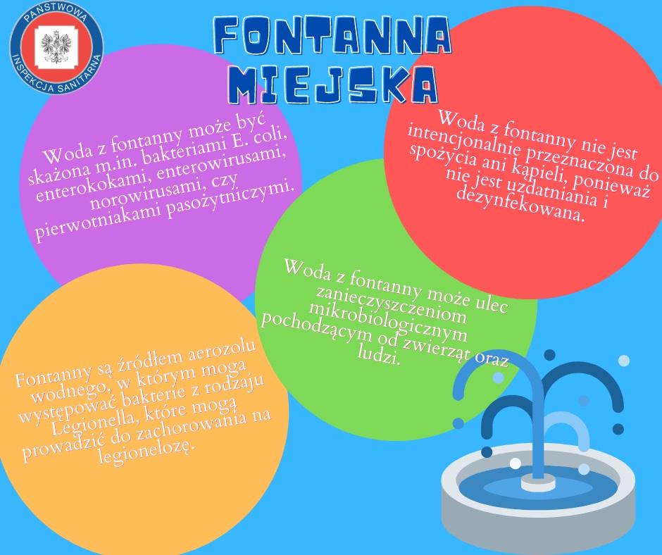 - fontanny są źródłem aerozolu wodnego, w którym mogą występować bakterie z rodzaju Legionella, które mogą prowadzić do zachorowania na legionelozę.