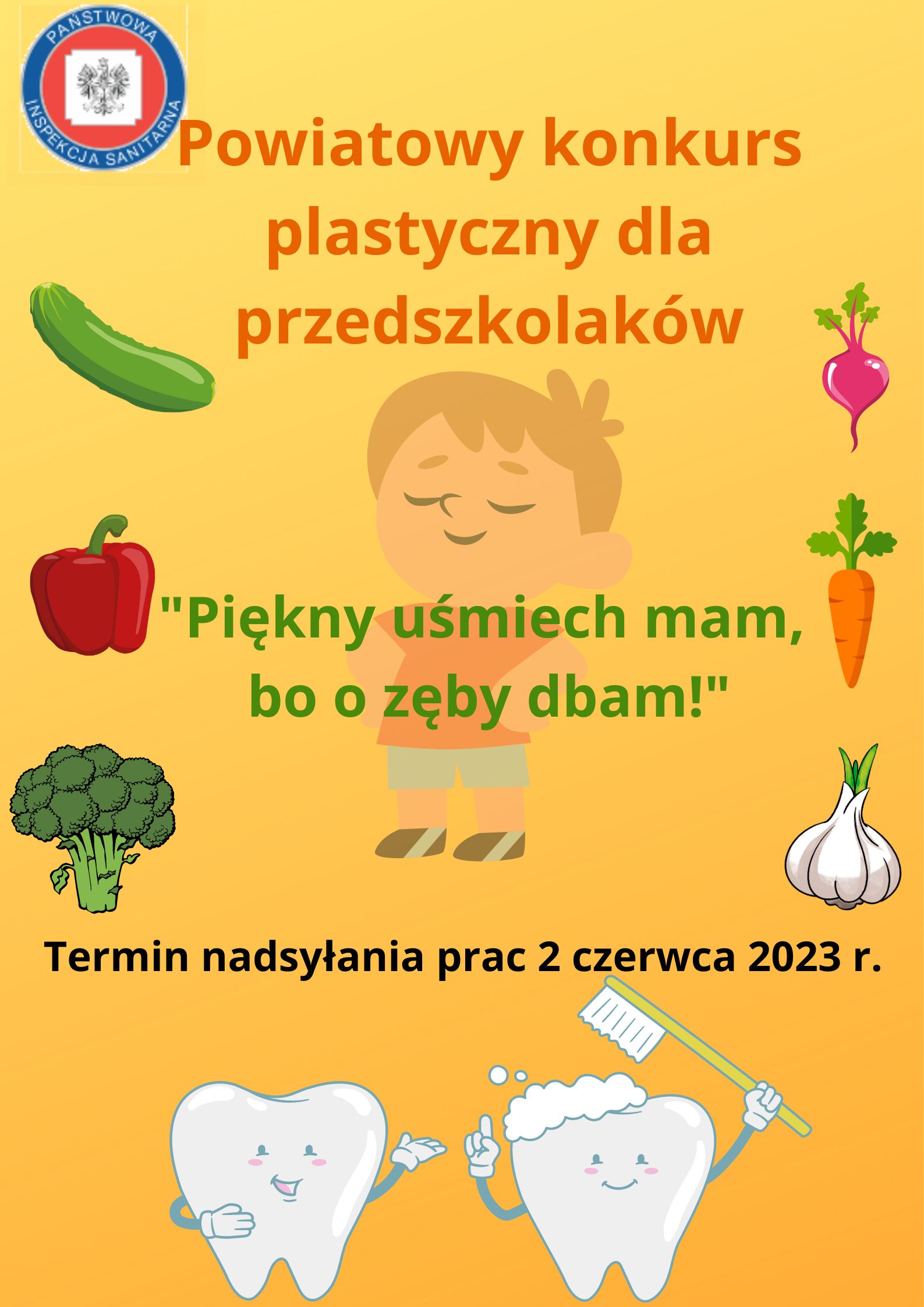 Państwowy Powiatowy Inspektor Sanitarny w Policach serdecznie zaprasza Przedszkolaki realizujące program "Zdrowe zęby mamy-marchewkę zajadamy" do udziału w powiatowym konkursie plastycznym pod hasłem "Piękny uśmiech mam, bo o zęby dbam!".