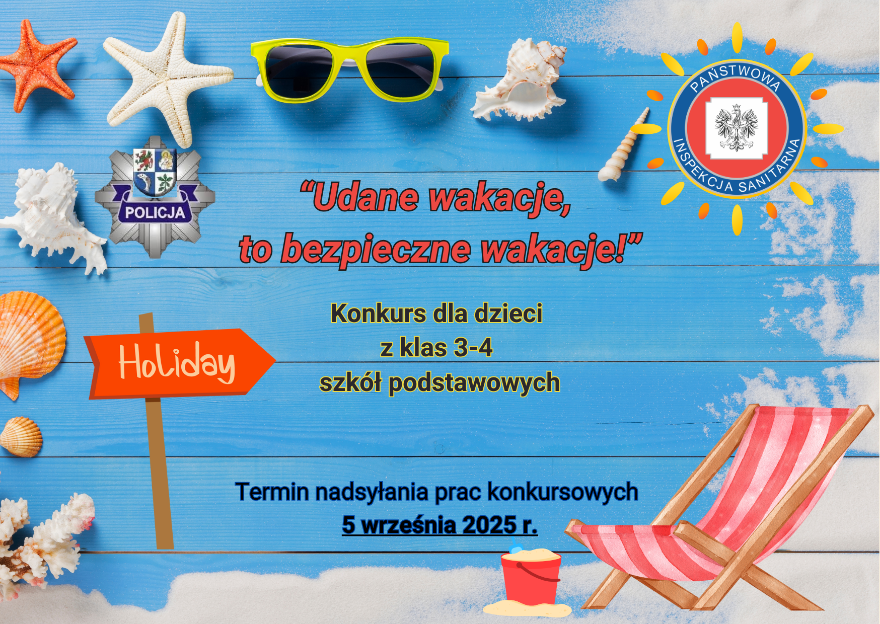 Państwowy Powiatowy Inspektor Sanitarny w Policach serdecznie zaprasza uczniów klas 3 i 4 szkół podstawowych zlokalizowanych na terenie powiatu polickiego do udziału w konkursie plastycznym pod hasłem „Udane wakacje, to bezpieczne wakacje!”.