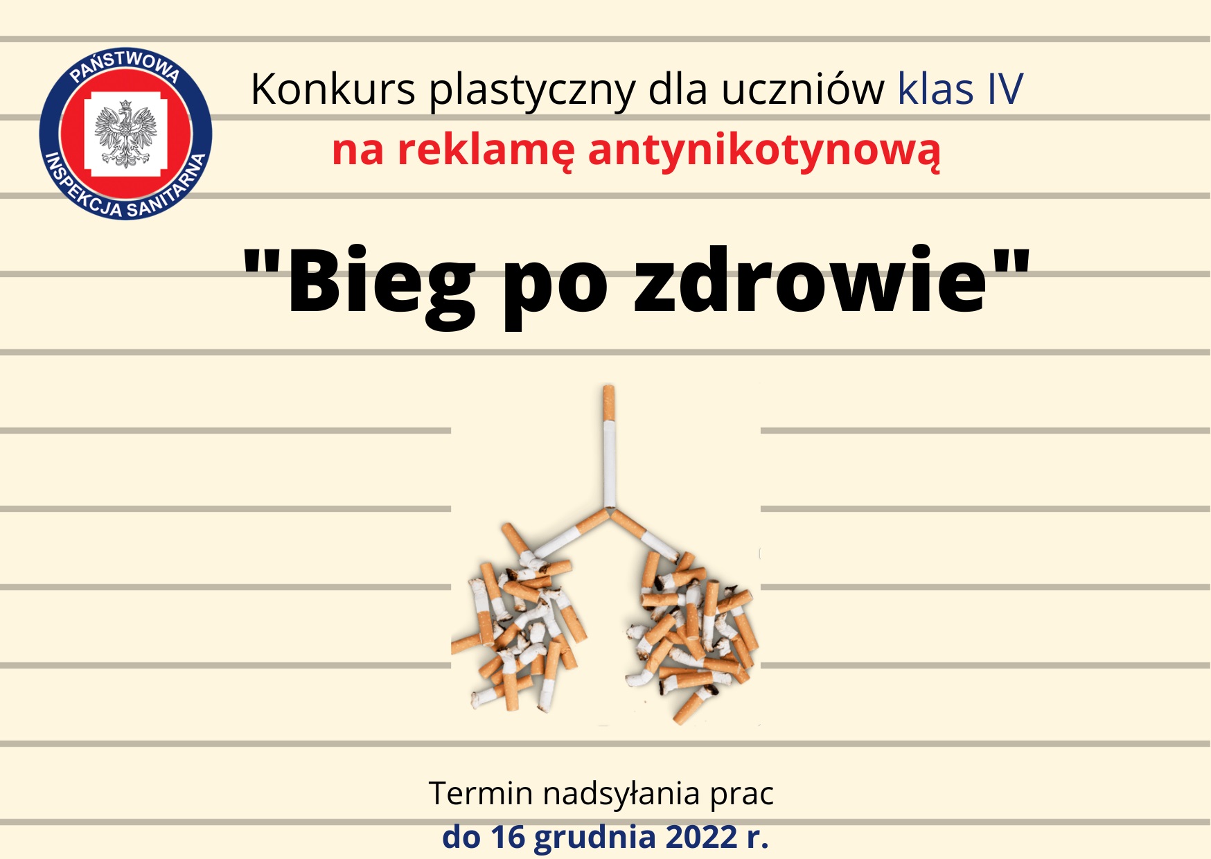 Państwowy Powiatowy Inspektor Sanitarny w Policach zaprasza czwartoklasistów realizujących program edukacji antynikotynowej „Bieg po zdrowie” do udziału w konkursie na antyreklamę palenia papierosów i używania nowatorskich wyrobów tytoniowych.