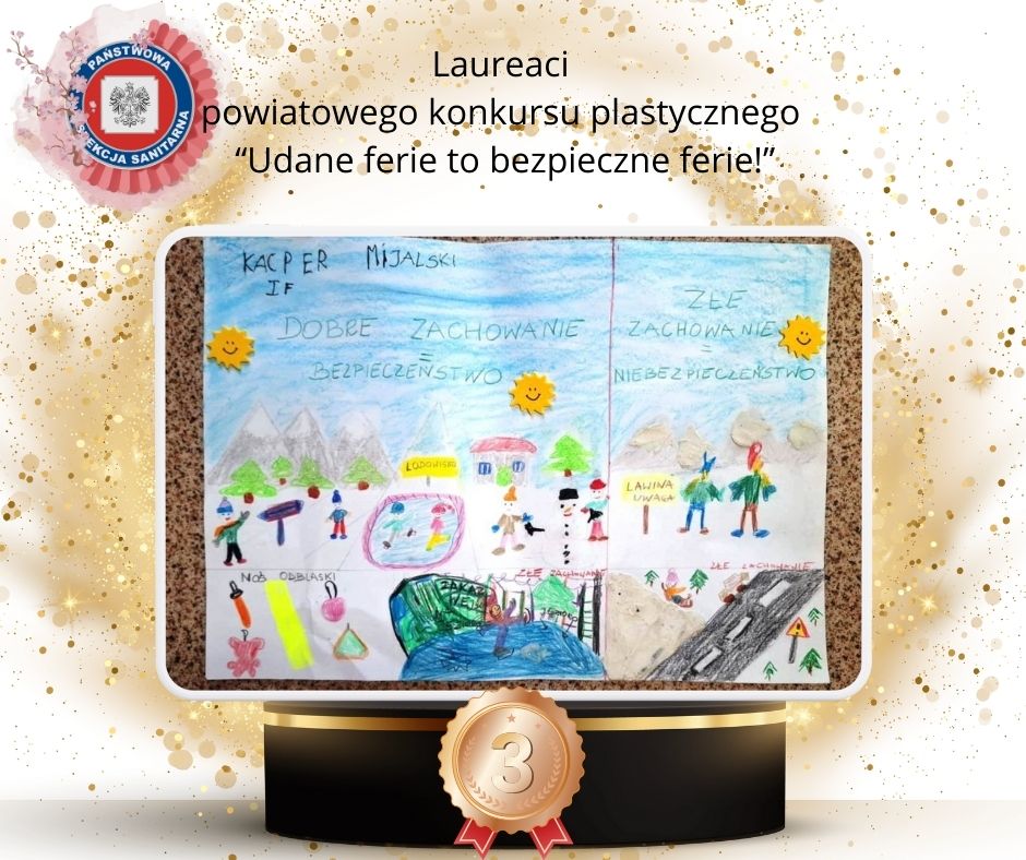 Państwowy Powiatowy Inspektor Sanitarny w Policach informuje, iż dnia 14 marca 2025 roku zakończył się konkurs plastyczny organizowany w ramach akcji Bezpieczne Ferie. Adresatami konkursu były jak co roku dzieci z klas I-III szkoły podstawowej.