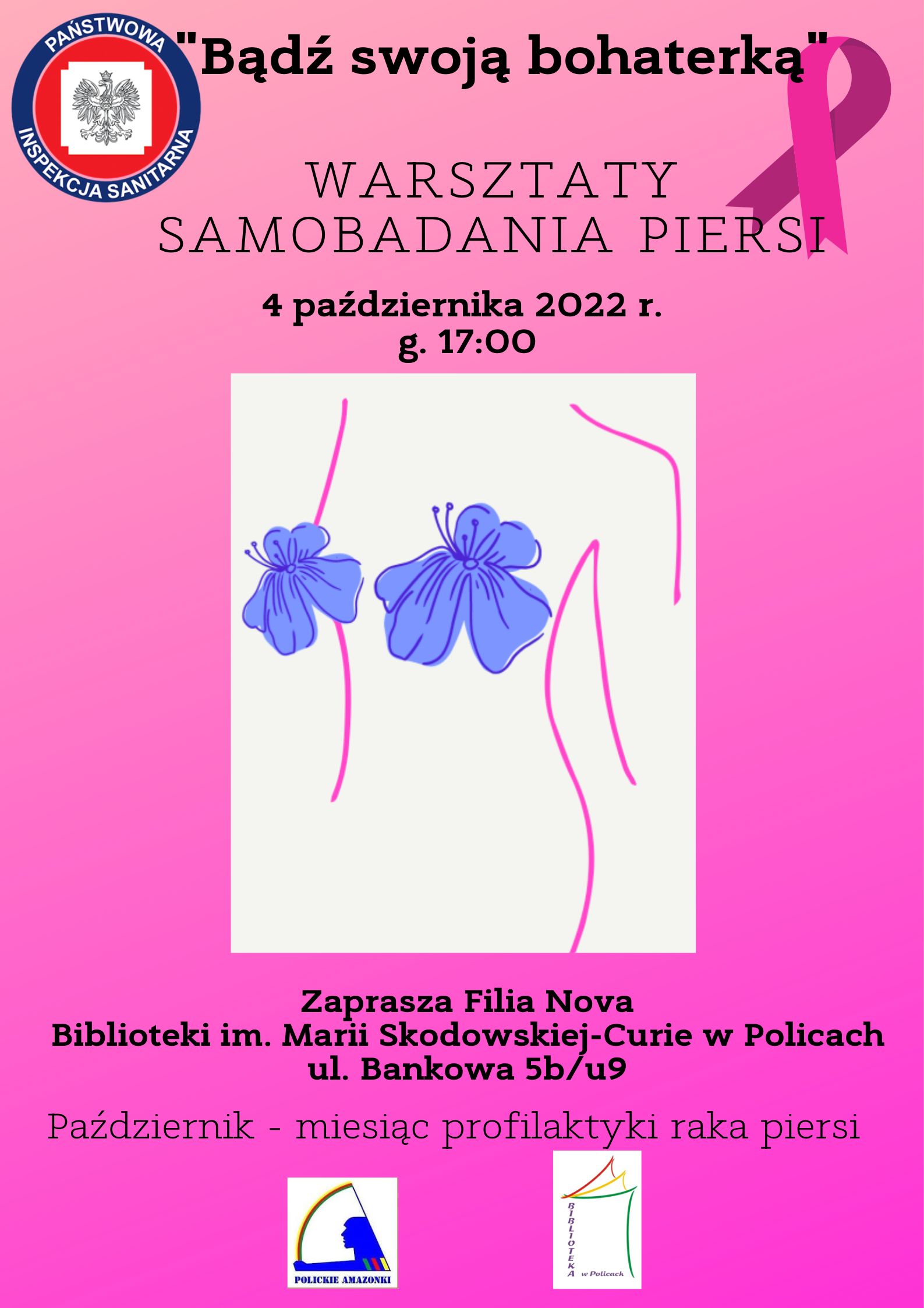 Państwowy Powiatowy Inspektor Sanitarny w Policach zaprasza panie na warsztaty samobadania piersi, które odbędą się 4 2022 r. o g. 17:00 w Bibliotece Filia Nova w Policach.