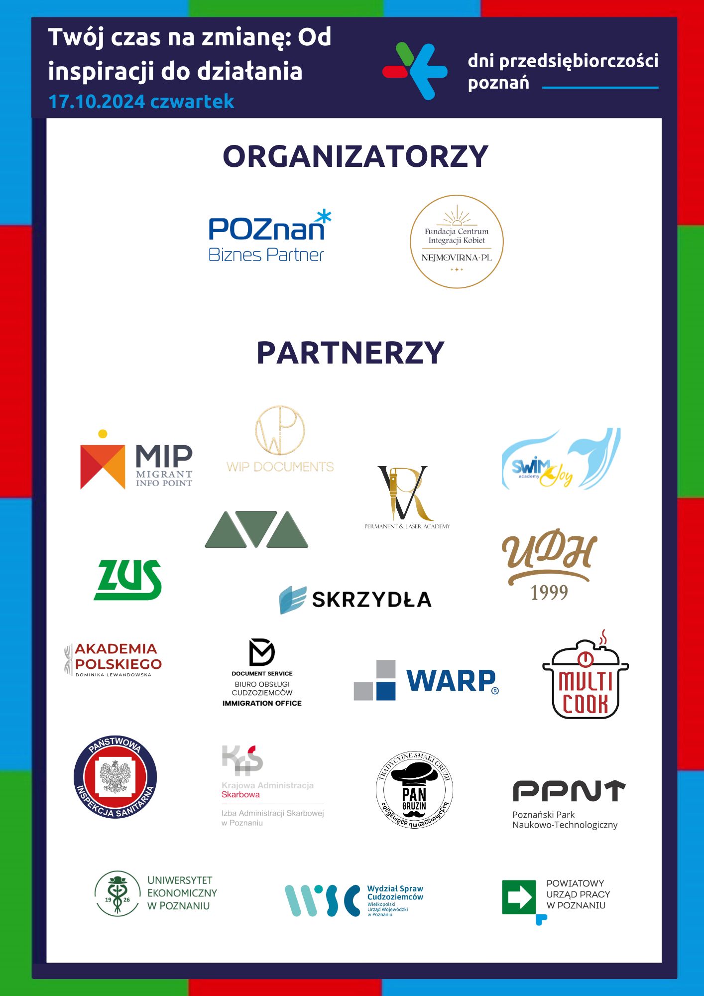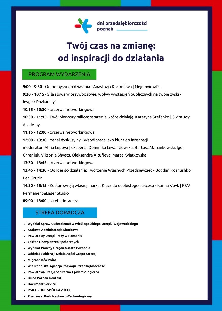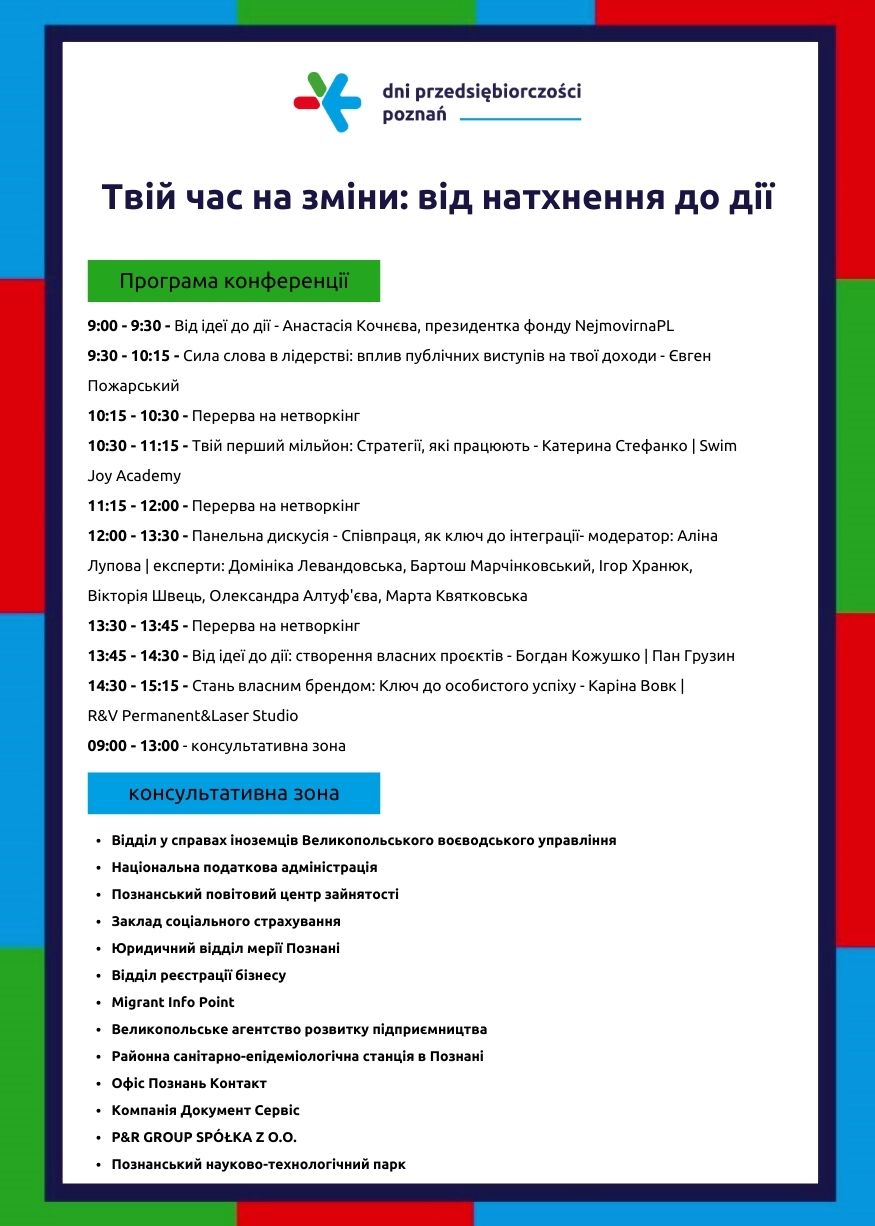 Szczegółowe informacje na temat programu oraz partnerów konferencji znajdują się na stronie internetowej Urzędu Miasta Poznania: Konferencja biznesowa "Twój czas na zmianę: Od inspiracji do działania" / "Твій час на зміни: від натхнення до дії" - Aktualności | Dni Przedsiębiorczości Poznań | Poznan.pl (www.poznan.pl)