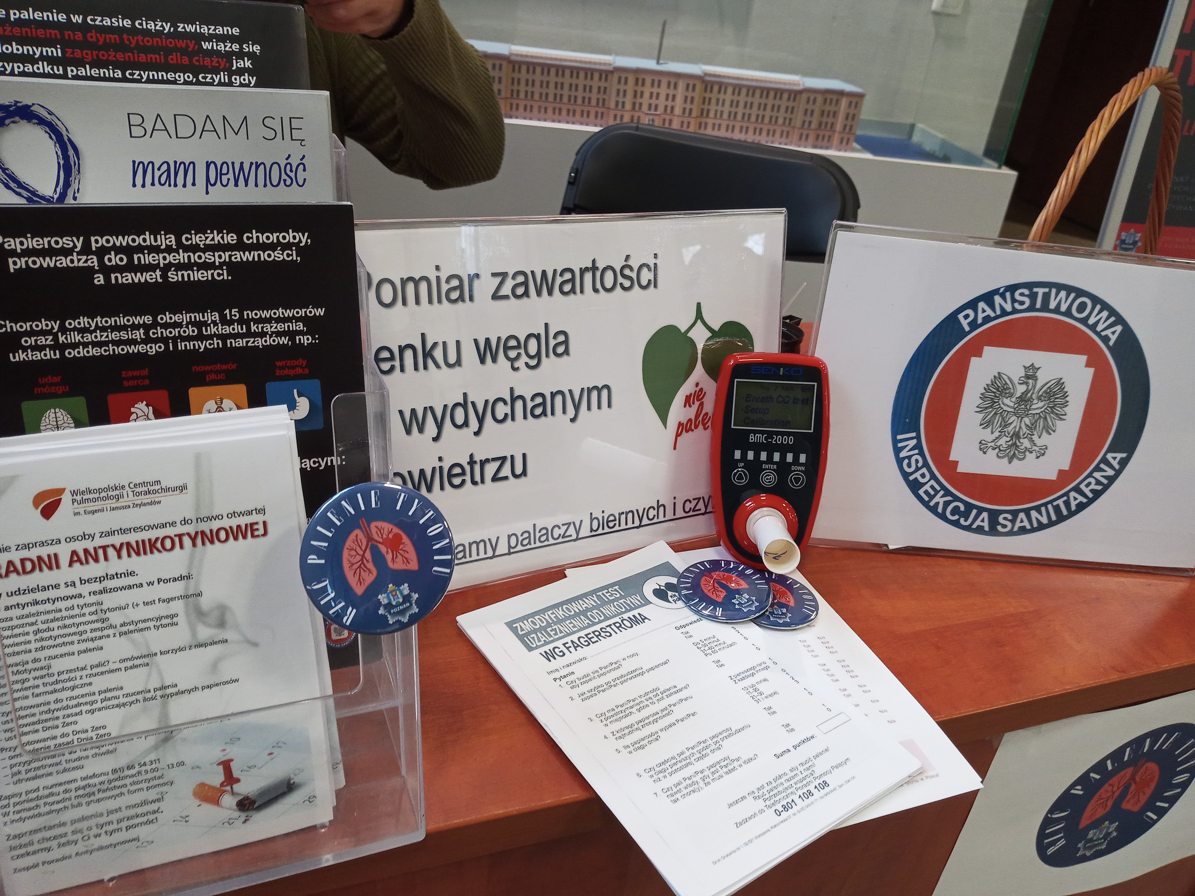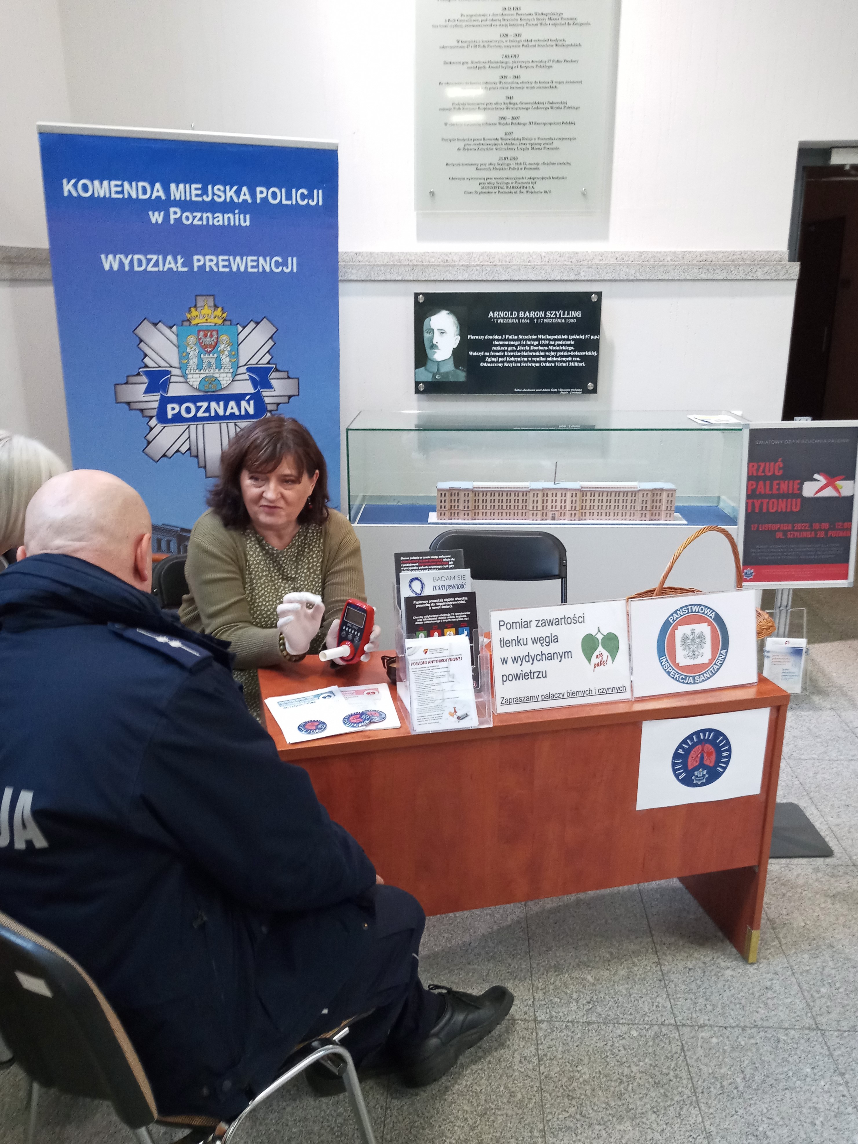 W dniu 17 listopada we współpracy z Komendą Miejską Policji w Poznaniu w budynku przy ul. Szylinga 2b utworzyliśmy stanowisko informacyjno-edukacyjne dla pracowników Komendy oraz petentów. Zainteresowane osoby mogły skorzystać z indywidualnego poradnictwa oraz dowiedzieć się ile tlenku węgla zawiera wydychane przez nich powietrze. Palacze w badaniu smokerlyzerem uzyskują najczęściej wyniki przekraczające normę, adekwatnie do ilości wypalanych papierosów. Wysoka zawartość CO w wydychanym powietrzu obrazuje negatywny wpływ palenia na dotlenienie całego organizmu. Proponując pomiar smokerlyzerem staramy się uświadomić palaczom, że palenie ma wymierne, negatywne skutki zdrowotne i to nie tylko te odległe ale również natychmiastowe.