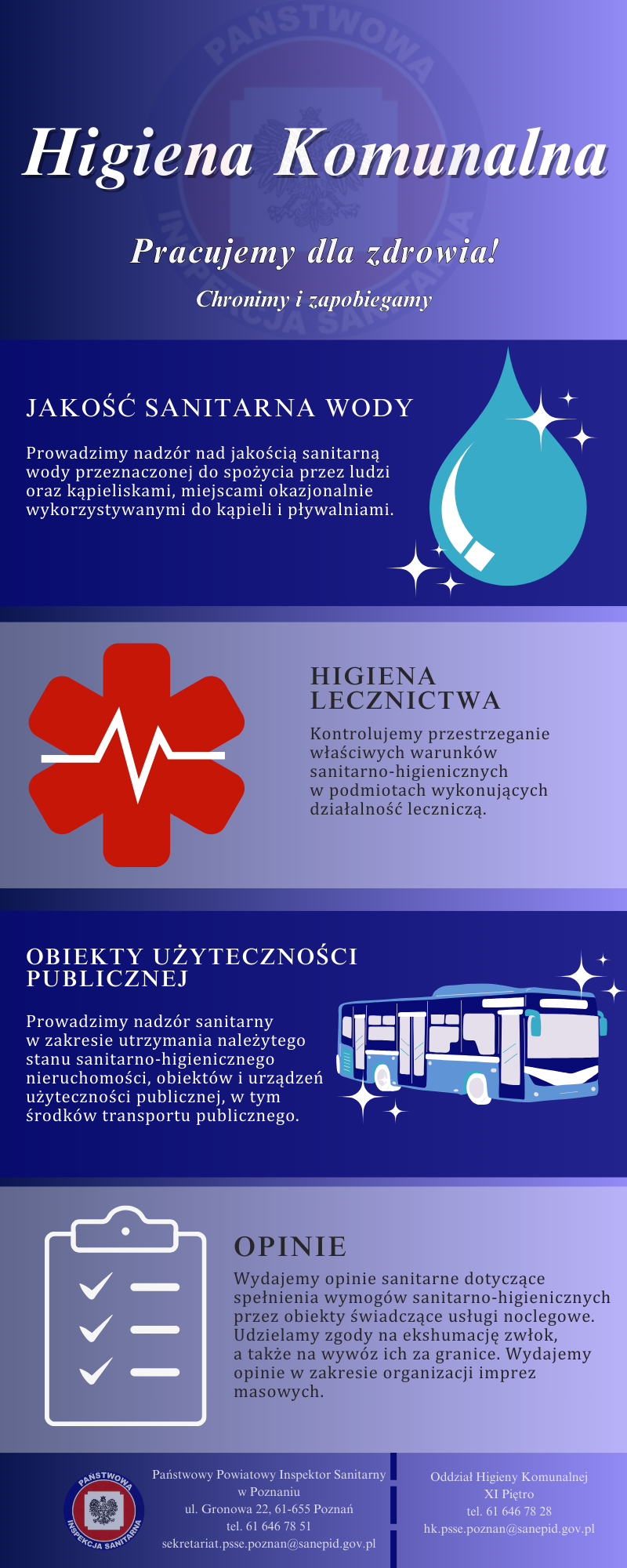 w szczególności: hotelach, pensjonatach, ośrodkach wypoczynkowych i turystycznych, zakładach opiekuńczych, zakładach fryzjerskich, kosmetycznych i odnowy biologicznej, podmiotach społeczno-kulturalnych i innych usługowych, środkach transportu publicznego: autobusowego, tramwajowego, kolejowego oraz środkach transportu specjalnego przeznaczenia; - podejmowaniu czynności formalno-prawnych w zakresie wniosków dotyczących wydawania zezwoleń na ekshumację oraz przewóz zwłok i szczątków, rozpatrywanie interwencji dotyczących stanu sanitarno-porządkowego.