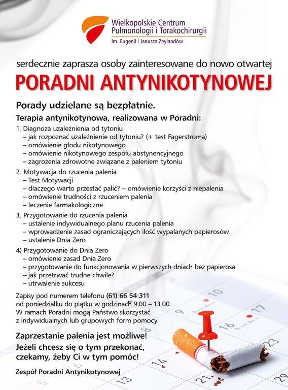 Osoby, które preferują kontakt osobisty w gabinecie mogą skorzystać z bezpłatnej Poradni Antynikotynowej w Wielkopolskim Centrum Pulmonologii i Torakochirurgii przy ul. Szamarzewskiego 62 – zapisy pod numerem telefonu 61 66 54 311 od poniedziałku do piątku w godzinach 900 - 1300. Poradnia oferuje indywidualne i grupowe formy pomocy. Szczegóły w załączonej poniżej ulotce.
