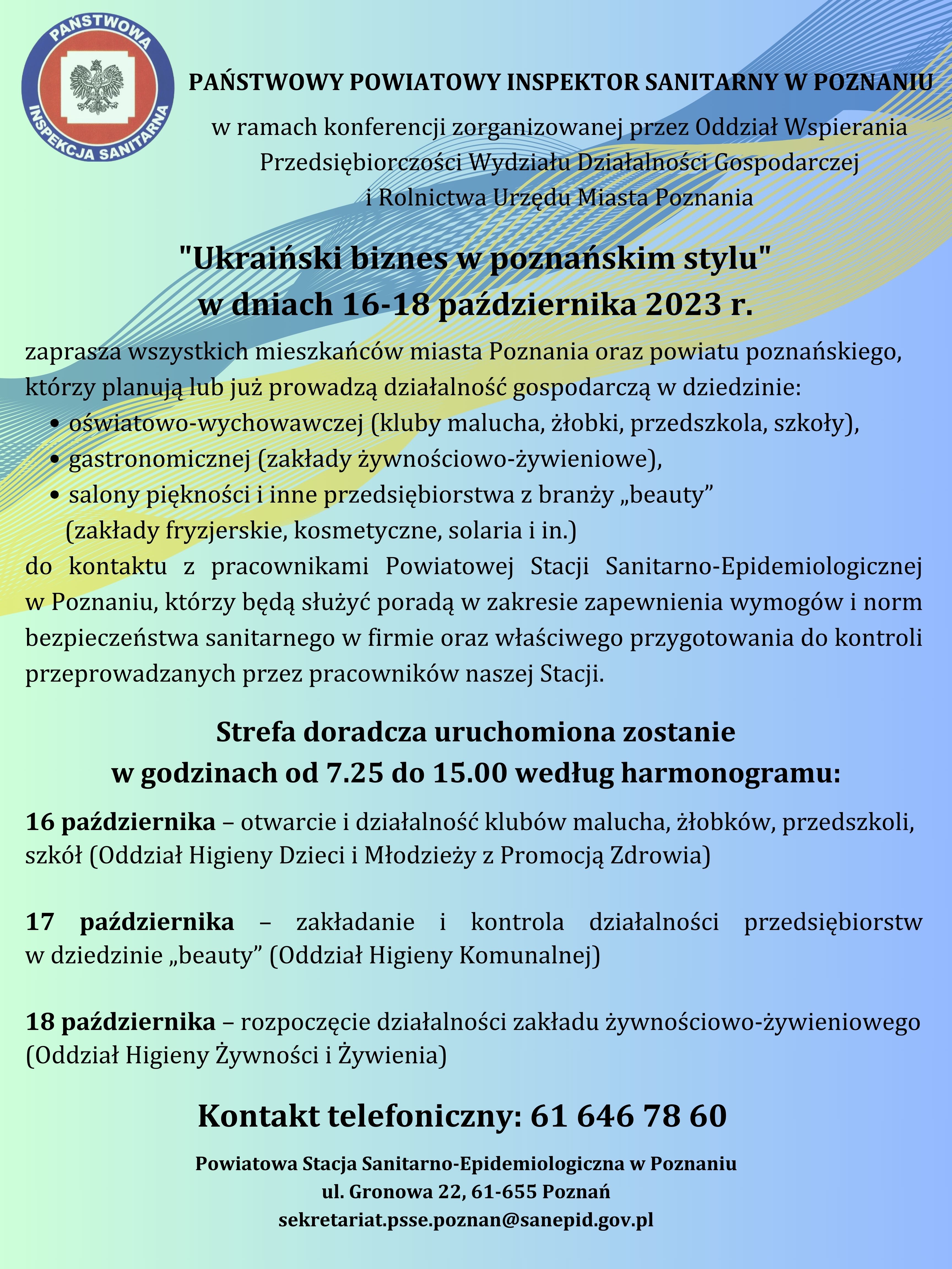 do kontaktu z pracownikami Powiatowej Stacji Sanitarno-Epidemiologicznej w Poznaniu, którzy będą służyć poradą w zakresie zapewnienia wymogów i norm bezpieczeństwa sanitarnego w firmie oraz właściwego przygotowania do kontroli przeprowadzanych przez pracowników naszej Stacji.