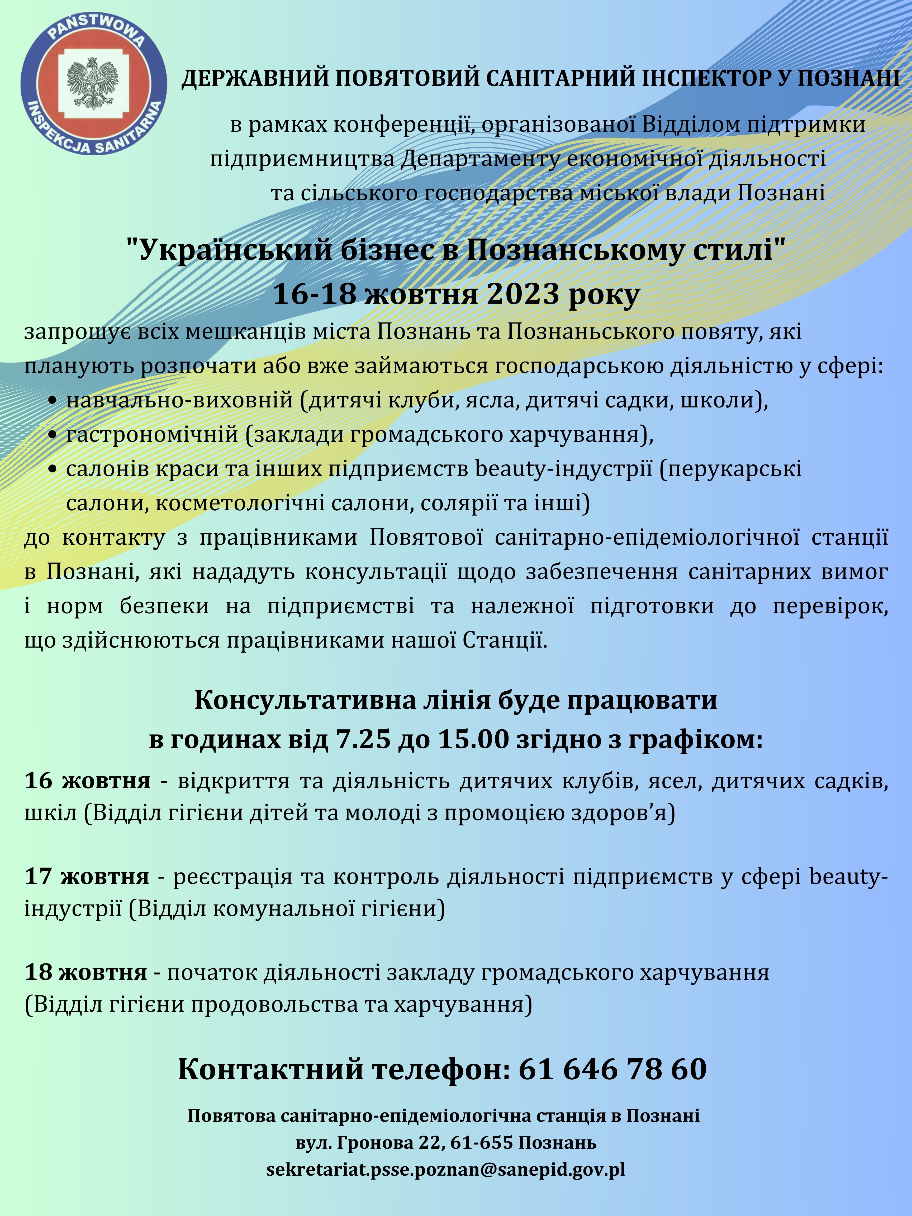 до контакту з працівниками Повятової санітарно-епідеміологічної станції в Познані, які нададуть консультації щодо забезпечення санітарних вимог і норм безпеки на підприємстві та належної підготовки до перевірок, що здійснюються працівниками нашої Станції.