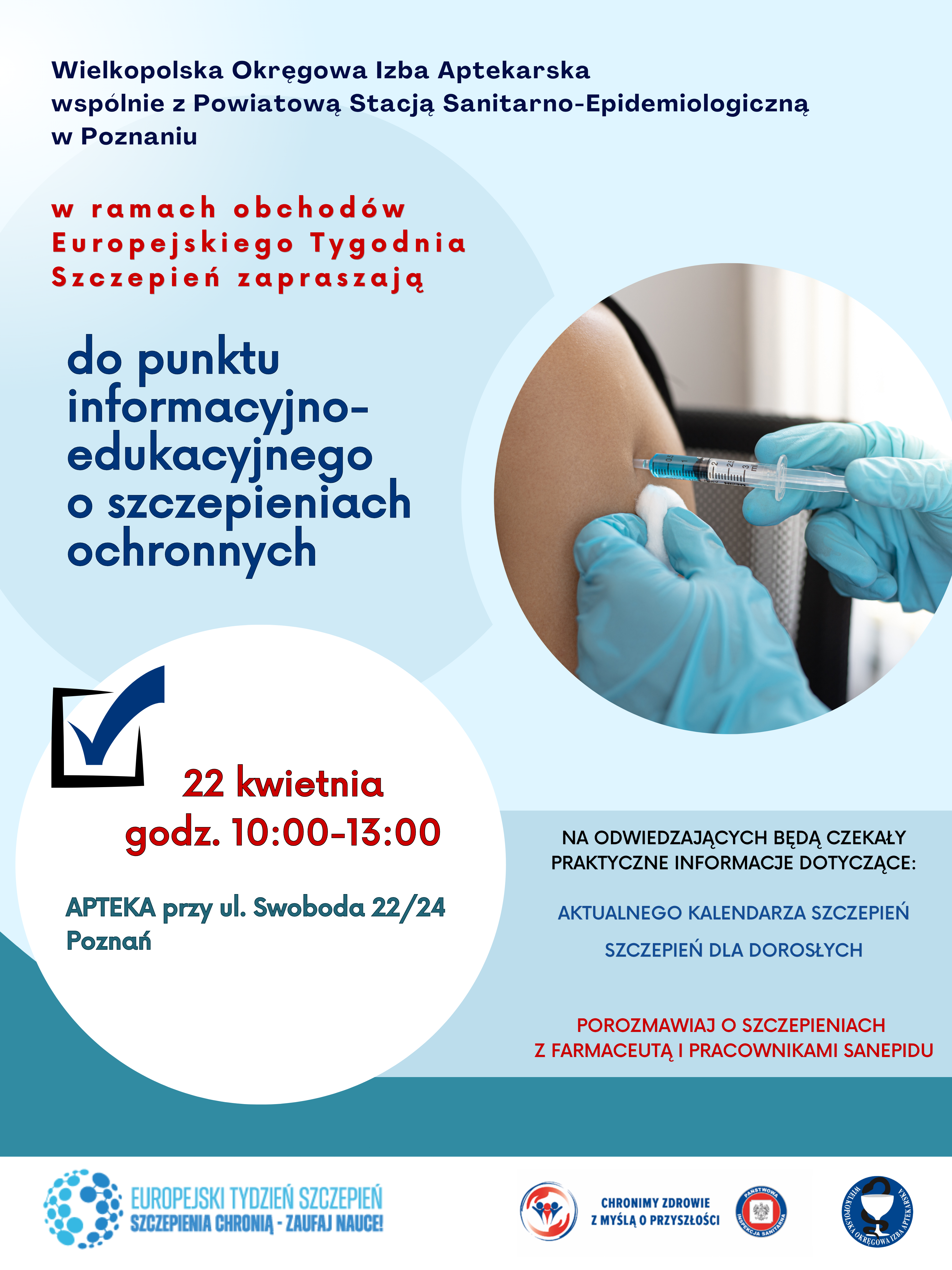 Z okazji Europejskiego Tygodnia Szczepień wspólnie z Wielkopolską Izbą Aptekarską serdecznie zapraszamy do odwiedzenia naszego punktu informacyjno-edukacyjnego.