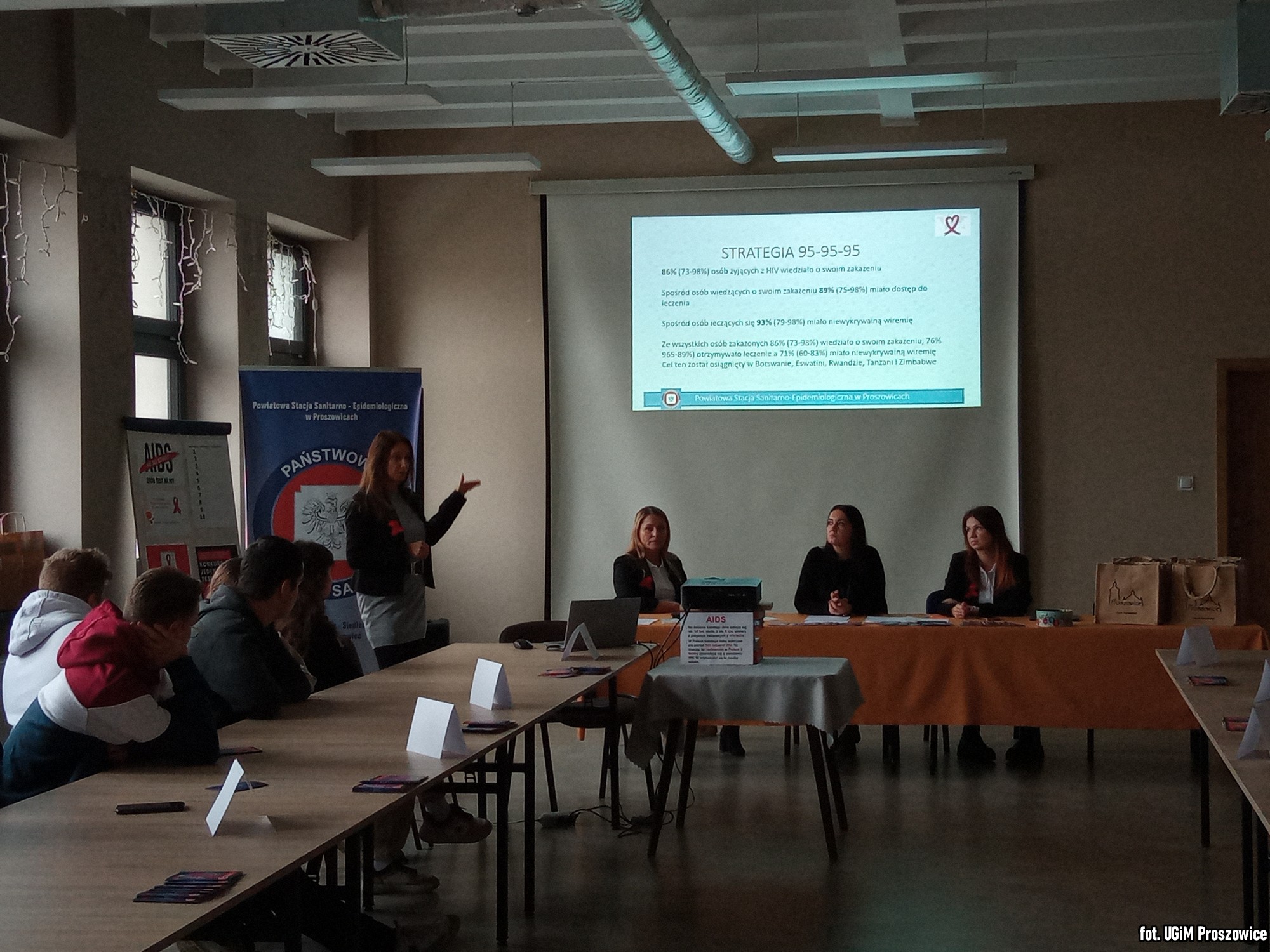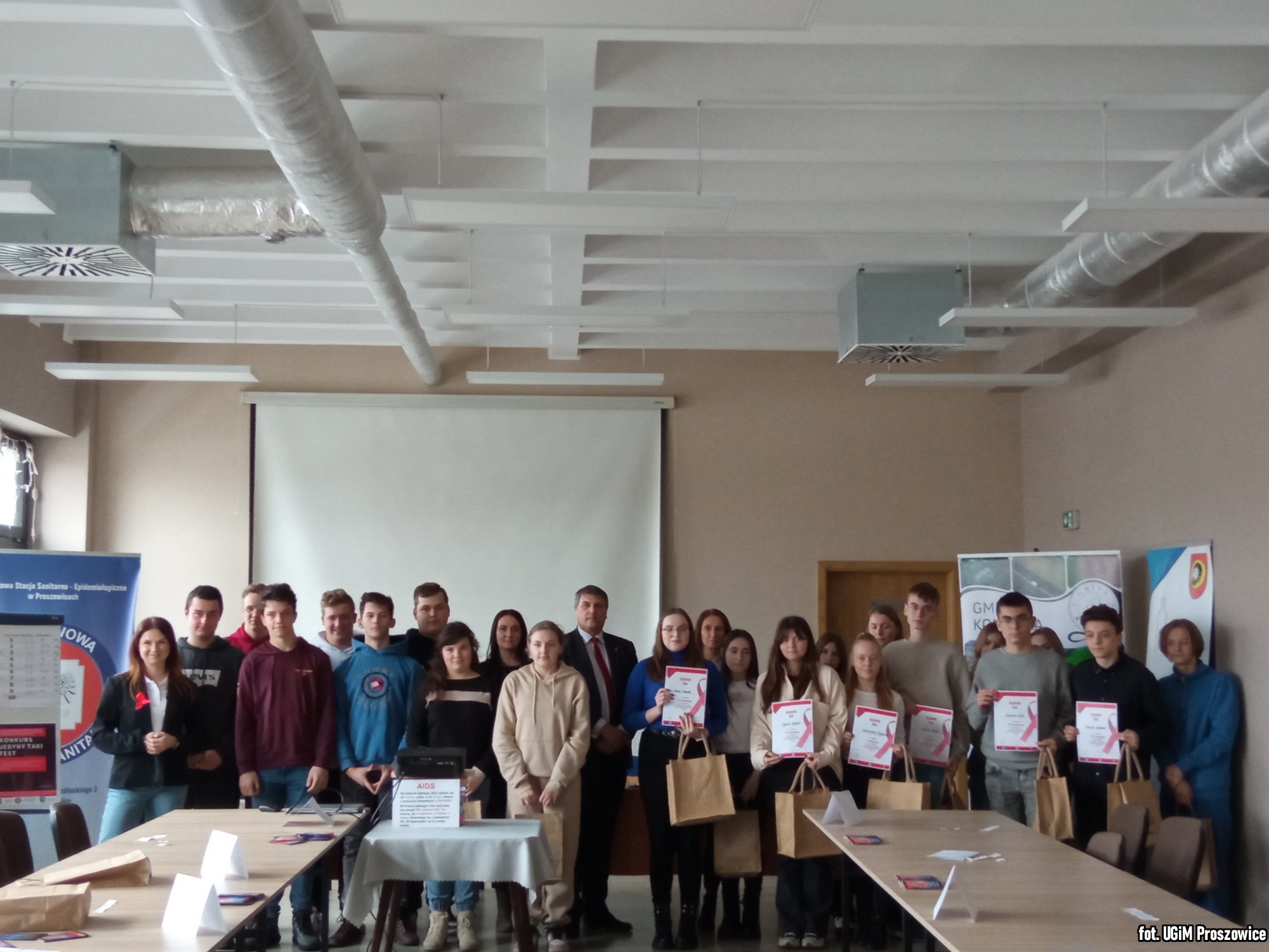 Na początku konkursu uczniowie wraz z nauczycielami wysłuchali prezentacji przygotowanej Przez Panią Annę Warchoł – pracownika Sekcji Epidemiologii Powiatowej Stacji Sanitarno-Epidemiologicznej w Proszowicach. Następnie Państwowy Powiatowy Inspektor Sanitarny w Proszowicach Pani Katarzyna Bandoła podsumowując prezentacje przekazała kilka najświeższych danych statystycznych które dotyczyły wykrywalności wirusa HIV na terenie naszego kraju. Po dużym zastrzyku wiedzy rozpoczął się konkurs. Młodzież szkolna losowała pytania na które odpowiadała ustnie, komisja konkursowa przydzielała punktację. Po dwóch kolejkach pytań przeszliśmy do konkurencji numer dwa w której drużyny odgrywały scenki związane z tematyką konkursu. Młodzież wykazała się kreatywnością i świetnie przekazała wylosowaną przez siebie treść, którą ujęła komisję konkursową. Posypały się wysokie noty.