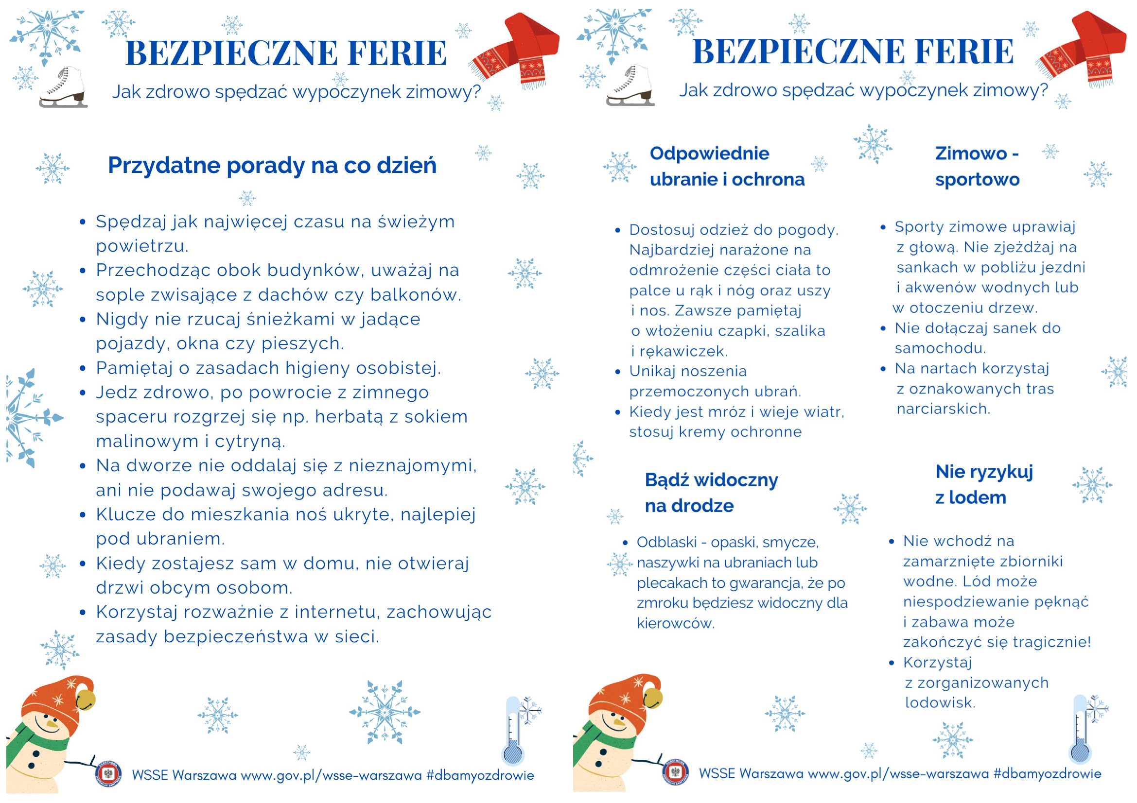 - zapobieganie wypadkom i urazom, z uwzględnieniem zasad bezpiecznego poruszania się po drogach oraz zagrożeń wynikających z zabaw dzieci na zamarzniętych rzekach i jeziorach.