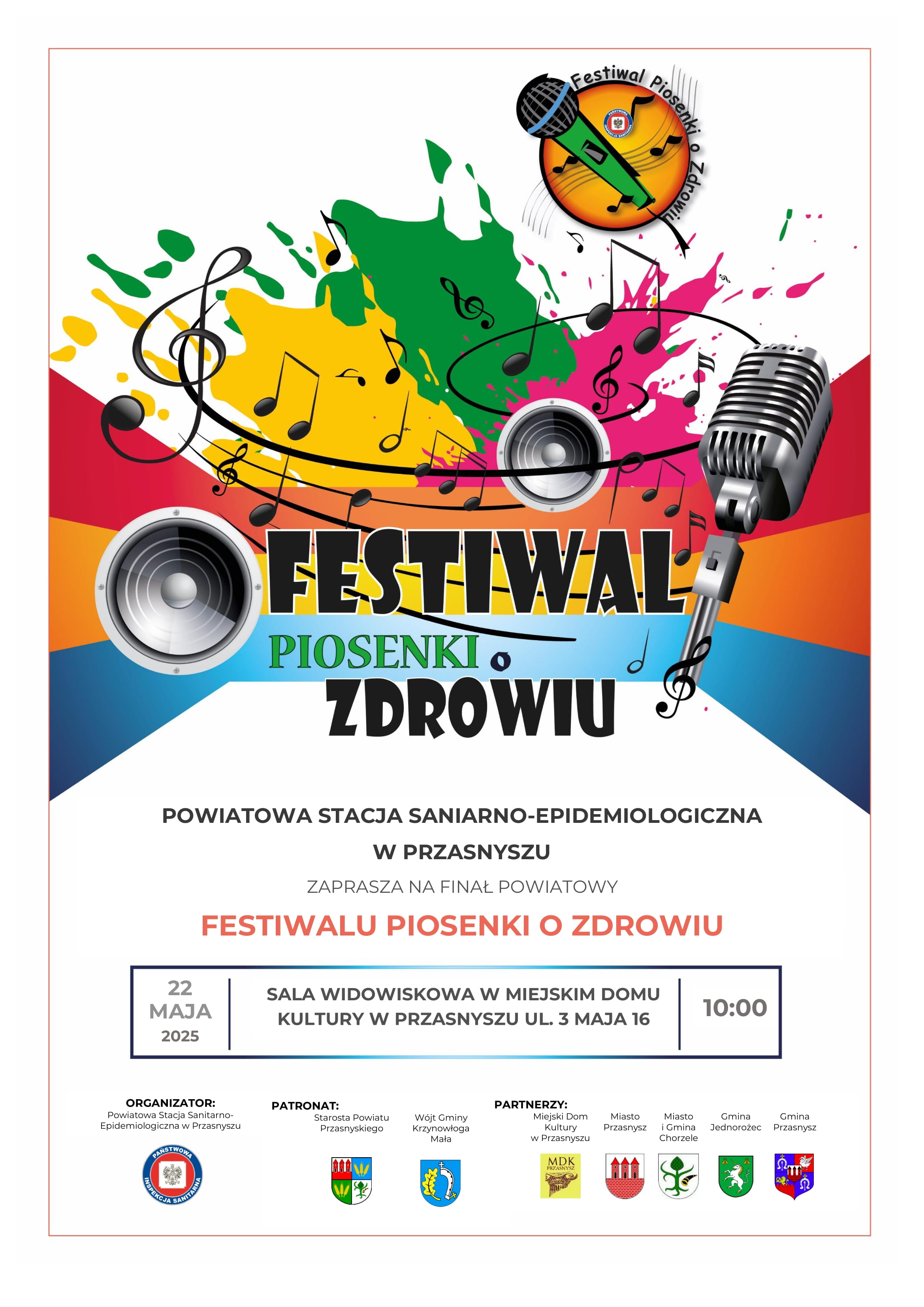 Powiatowa Stacja Sanitarno-Epidemiologiczna w Przasnyszu serdecznie zaprasza mieszkańców powiatu na Powiatowy Etap Festiwalu Piosenki o Zdrowiu, który odbędzie się 22 maja 2025 r. (czwartek) o godz. 10:00 w Miejskim Domu Kultury w Przasnyszu.