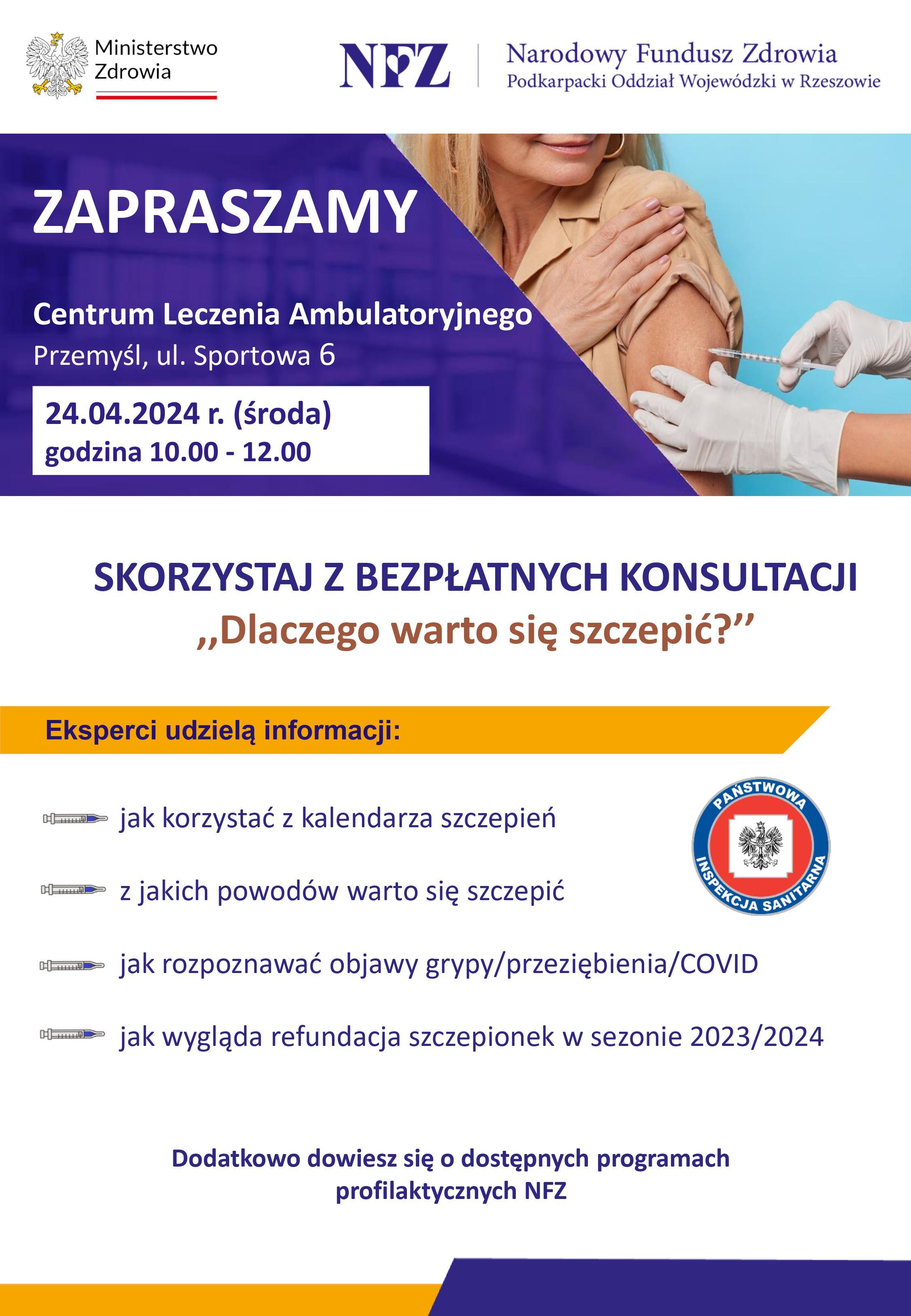 Powiatowa Stacja Sanitarno-Epidemiologiczna w Przemyślu zaprasza na akcję organizowaną przez Narodowy Fundusz Zdrowia- Podkarpacki Oddział Wojewódzki w Rzeszowie z okazji Europejskiego Tygodnia Szczepień. Już w środę, 24 kwietnia 2024 r., w godzinach 10:00-12:00 w Przychodni na ul. Sportowej 6 w Przemyślu będzie można dowiedzieć się, skorzystać z konsultacji dotyczących szczepień ochronnych. Serdecznie zapraszamy