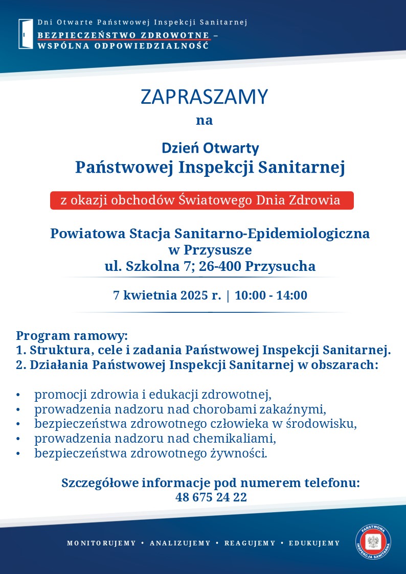 Państwowy Powiatowy Inspektor Sanitarny w Przysusze zaprasza na Dzień Otwarty w PSSE w Przysusze, który odbędzie się 7 kwietnia 2025 r. w godz. 10:00 – 14:00.