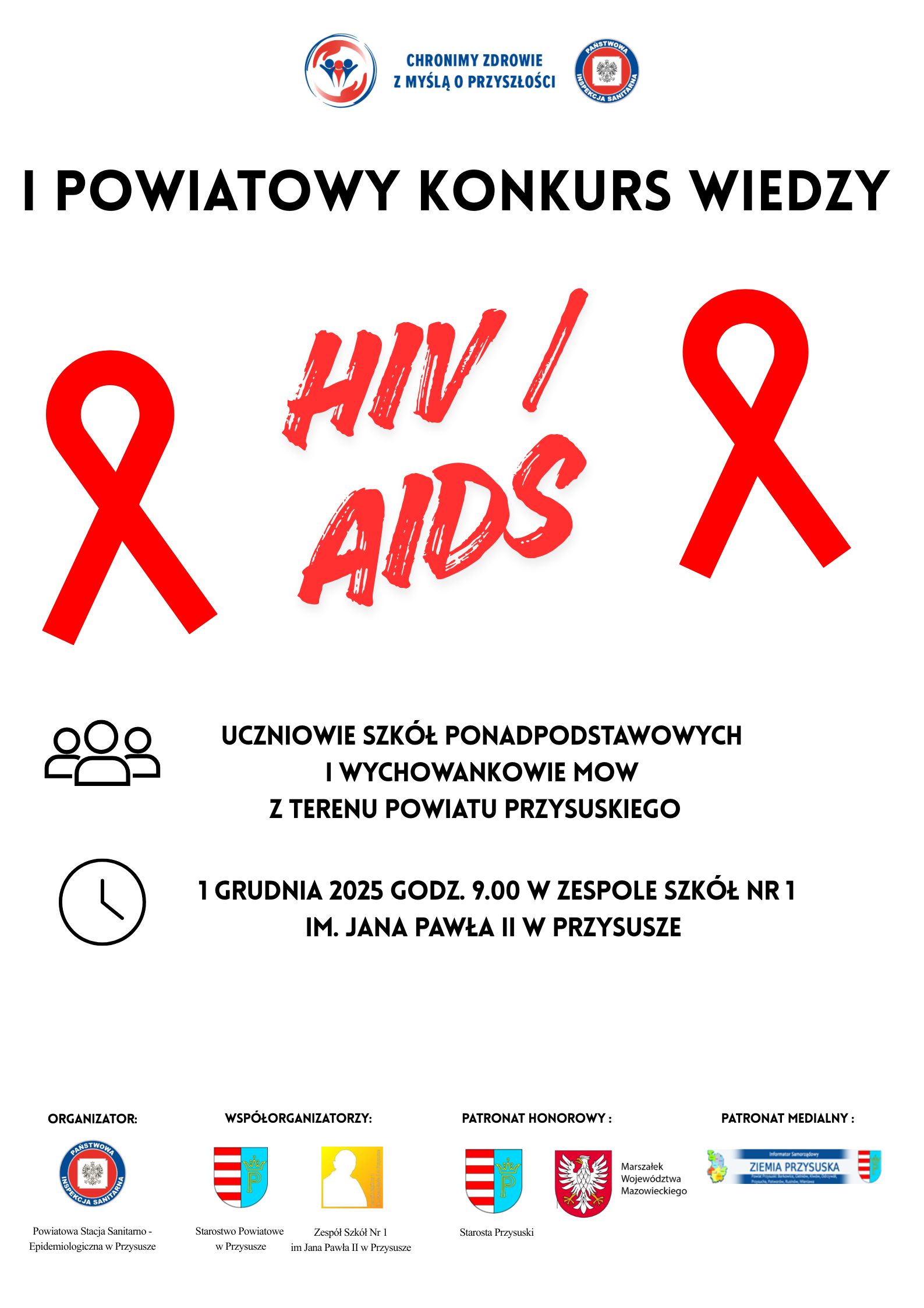 Państwowy Powiatowy Inspektor Sanitarny w Przysusze serdecznie zaprasza uczniów szkół ponadpodstawowych oraz wychowanków Młodzieżowych Ośrodków Wychowawczych (kształcących się w szkołach ponadpodstawowych) do wzięcia udziału w I Powiatowym Konkursie Wiedzy o HIV i AIDS, który odbędzie się 01.12.2025 r. o godz. 9:00 w budynku Zespołu Szkół Nr 1 im. Jana Pawła II w Przysusze, Al. Jana Pawła II 13, 26-400 Przysucha.