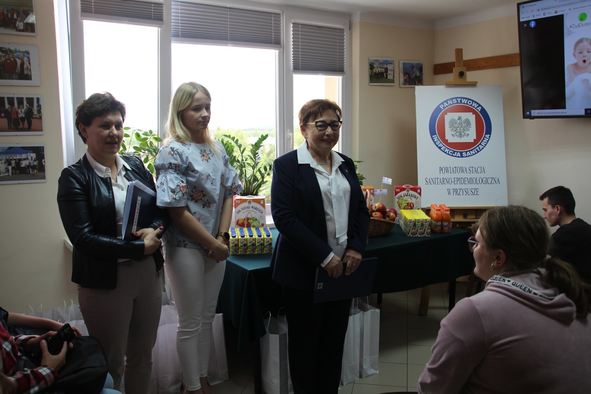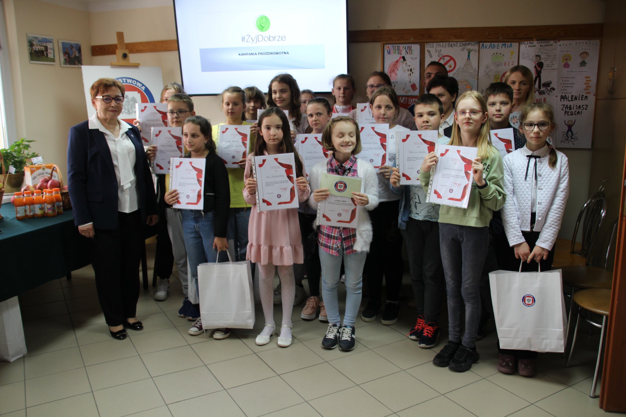 Wręczenie nagród odbyło się w siedzibie PSSE w Przysusze, ul. Szkolna 7. Nagrody wręczyła Pani Inspektor Jolanta Wilk – Państwowy Powiatowy Inspektor Sanitarny w Przysusze. Nawiązując do profilaktyki prozdrowotnej Pani Inspektor przedstawiła założenia obecnie prowadzonej kampanii pod hasłem #ŻyjDobrze. Dzieci dowiedziały się, że codzienne nawet drobne działania budują zdrowie psychiczne i fizyczne. A w życiu codziennych powinny dokonywać wyborów, które sprzyjają zdrowiu. ![]()