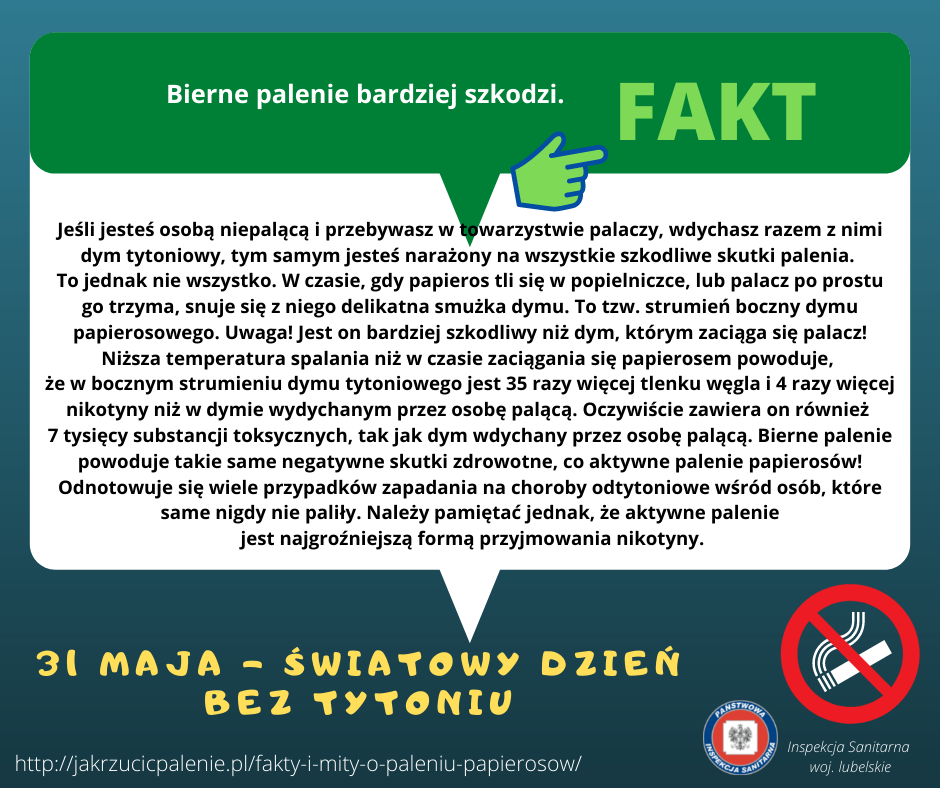 Bierne palenie także szkodzi. Uzależnienie od tytoniu pogarsza jakość życia, powodując choroby układu oddechowego, choroby układu krążenia oraz choroby nowotworowe. Szacuje się, że co roku 70 tysięcy Polaków umiera z powodu chorób odtytoniowych. Trzy grupy chorobowe występujące prawie wyłącznie u palaczy to: rak płuca, przewlekła obturacyjna choroba płuc oraz zawał serca występujący przed 50 rokiem życia. Na samego raka płuca umiera rocznie 20 tysięcy Polaków. Osoby palące powinny pamiętać o tym, że ich nałóg zagraża też osobom z ich otoczenia. Bierne palenie związane z wdychaniem dymu papierosowego jest wyjątkowo niebezpieczne. Boczny strumień dymu papierosowego zawiera od 5 do 15 razy więcej tlenku węgla i od 2 do 20 razy więcej nikotyny niż dym wdychany przez palaczy. Paląc przy innych osoby uzależnione zwiększają u osób niepalących ryzyko zachorowania na raka płuca i choroby serca. Ponadto kontakt biernych palaczy z dymem tytoniowym osłabia ich zdolność do pracy, zmniejsza wydajność, demobilizuje i pogarsza samopoczucie.