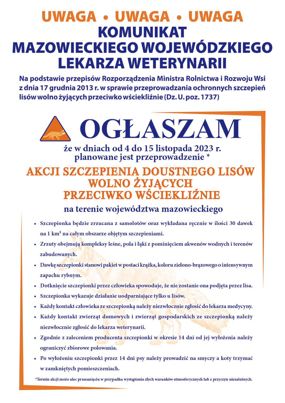 Мазовецька воєводська ветеринарна служба інформує, що з 4 по 15 листопада 2023 року в Мазовецькому воєводстві, включно з Радомським повітом, запланована кампанія пероральної вакцинації проти сказу вільноживучих лисиць.