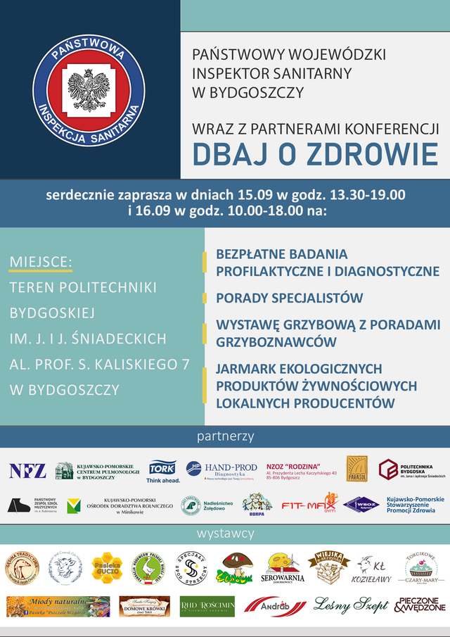 Wrzesień czyli początek roku szkolnego to idealny miesiąc, aby przypomnieć pedagogom, nauczycielom, pracownikom placówek oświatowo-wychowawczych oraz rodzicom o zagrożeniach, które czekają na dzieci i młodzież. Podczas konferencji naukowo-szkoleniowej „Dbaj o zdrowie” pod honorowym patronatem Wojewody Kujawsko-Pomorskiego chcemy zwrócić szczególną uwagę na uzależnienia. Konferencji towarzyszyć będzie dwudniowy Jarmark Ekologicznych produktów żywnościowych od lokalnych producentów. Zapraszamy!
