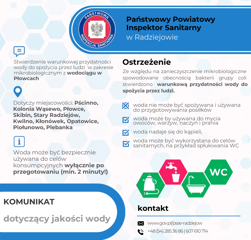 Komunikat Nr 1 Państwowego Powiatowego Inspektora Sanitarnego w Radziejowie z dnia 26.09.2024 r. dotyczący wodociągu w Płowcach