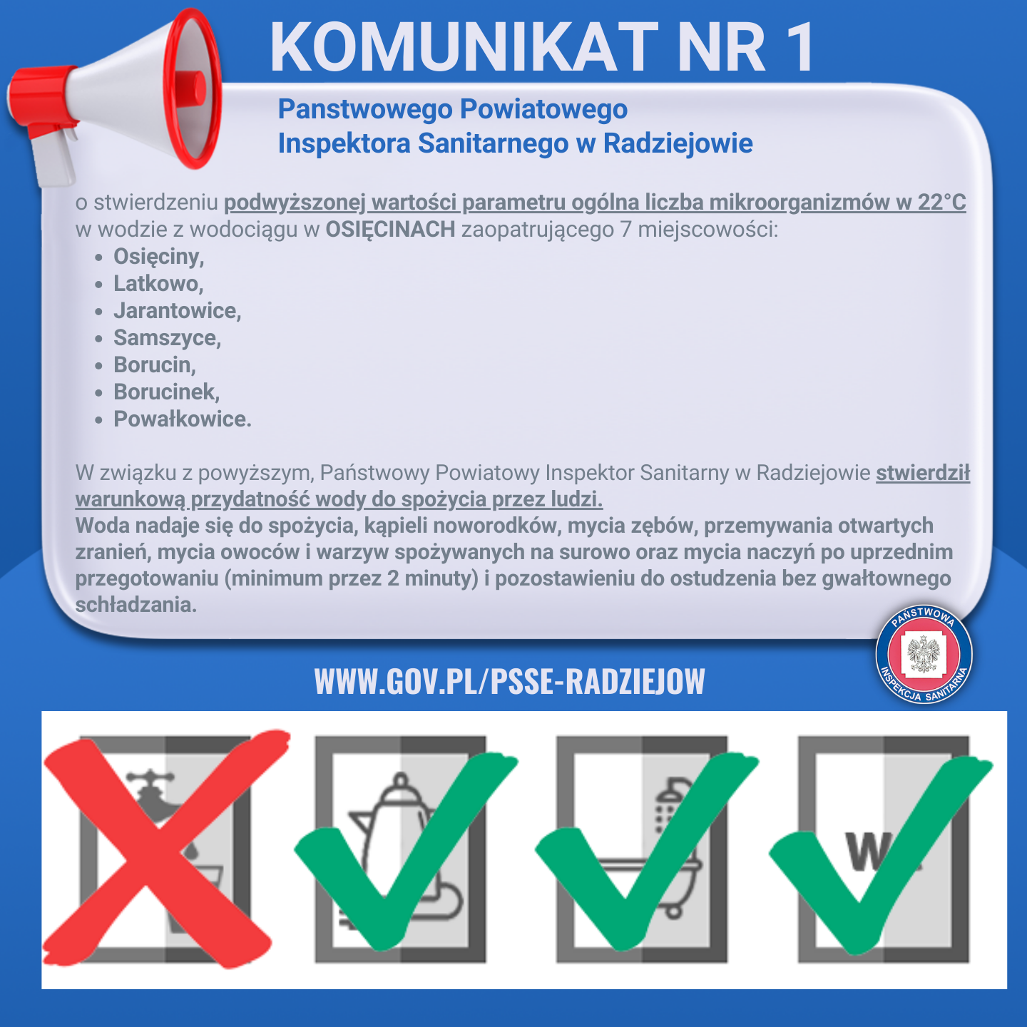 Komunikat Nr 1 z dnia 20.09.2023 Państwowego Powiatowego Inspektora Sanitarnego w Radziejowie dotyczący wodociągu w Osięcinach