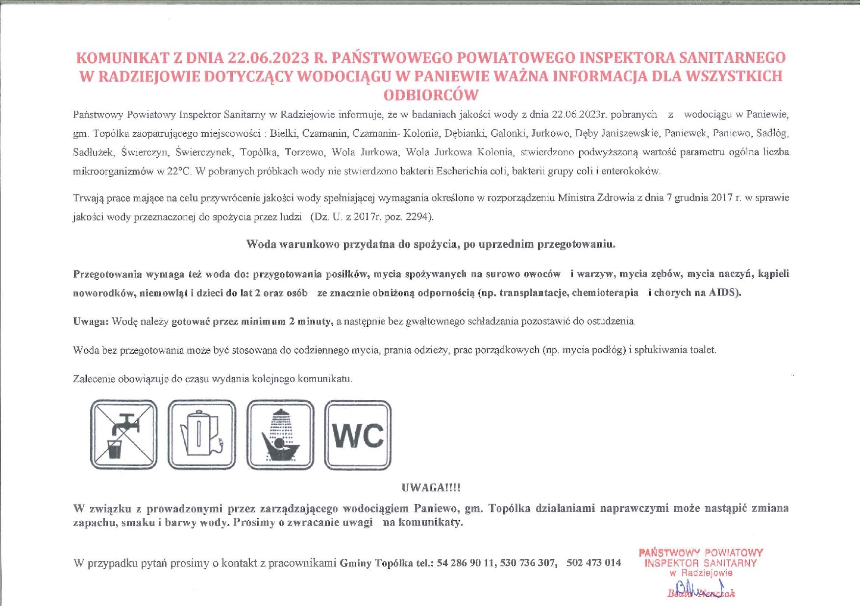 Komunikat z dnia 22.06.2023 r. Państwowego Powiatowego Inspektora Sanitarnego w Radziejowie dotyczący wodociągu w Paniewie.Komunikat_22-06-2023r.jpg 0.35MB