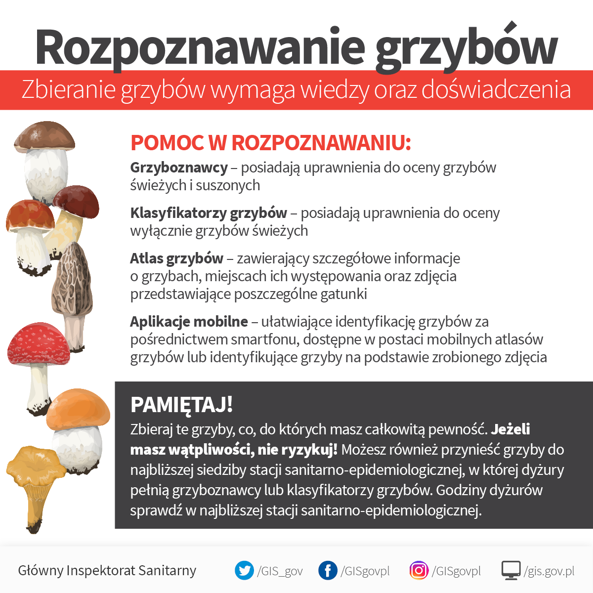 Zbieranie grzybów wymaga wiedzy i doświadczenia. Aby mieć całkowitą pewność co do tego, czy zebrane przez Ciebie grzyby są jadalne, przynieś je do najbliższej Stacji Sanitarno-Epidemiologicznej i uzyskaj bezpłatną poradę grzyboznawcy lub klasyfikatora grzybów. Specjaliści dokładnie obejrzą wszystkie dostarczone grzyby i dokonają oceny gatunkowej każdego z nich. Pamiętaj, aby przynosić całe, nieuszkodzone i dobrze wykształcone owocniki.