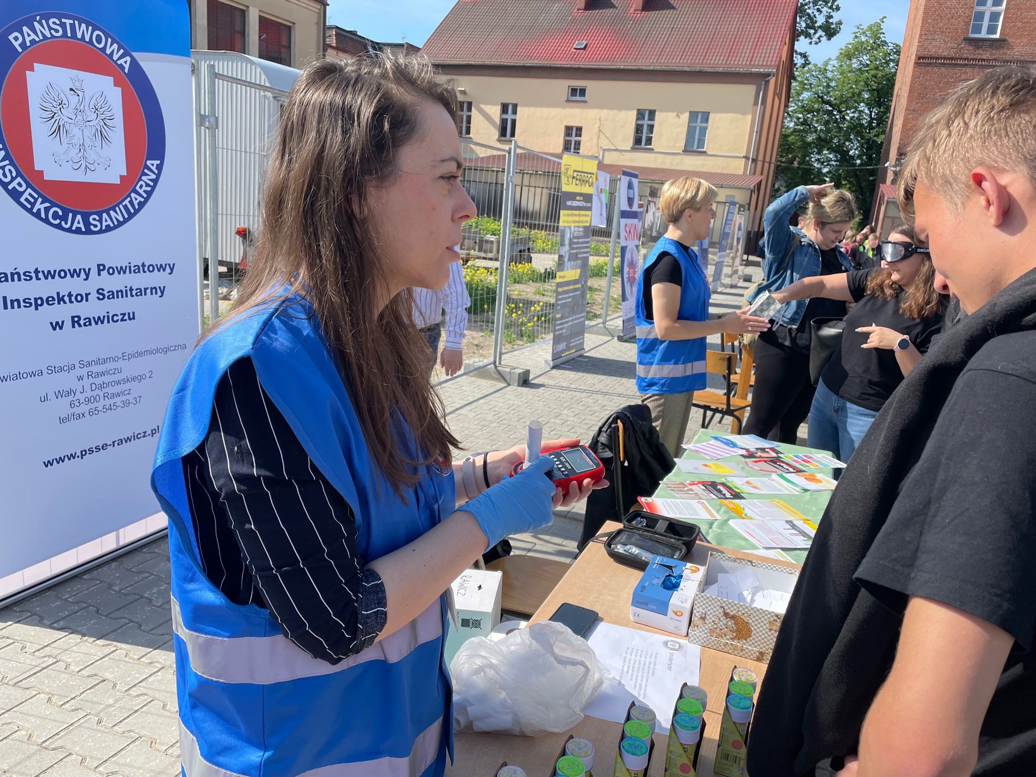 W ramach obchodów „Dnia Dziecka połączony z Profilaktyką Zdrowotną” Powiatowa Stacja Sanitarno – Epidemiologiczna w Rawiczu w dniu 31 maja zorganizowała w Zespole Szkół Zawodowych w Rawiczu punkt informacyjno- edukacyjny. Zainteresowanym uczniom pracownicy PSSE w Rawiczu przeprowadzili bezpłatne, nieinwazyjne pomiary zawartości tlenku węgla w wydychanym powietrzu przy użyciu smokolajzera. Prowadzone były też rozmowy informacyjno- edukacyjne w zakresie profilaktyki używania tytoniu. Uczniowie stoiska mogli również skorzystać z alkogogli, które pokazywały zaburzenie widzenia po spożyciu alkoholu.